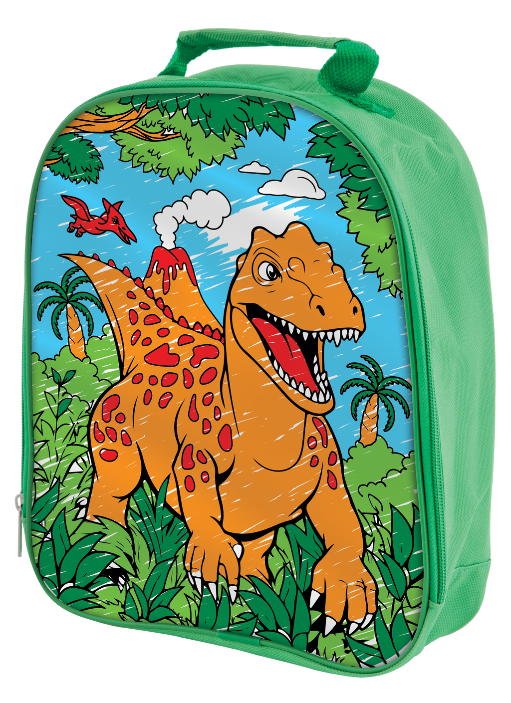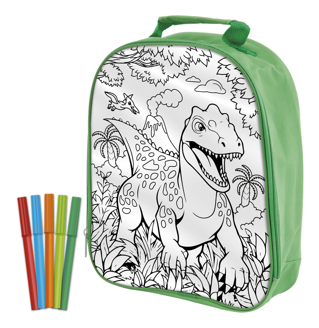 The high-quality backpack features a cool Dinosaur Expedition theme, with a printed outline of a mighty T-Rex, a volcano, and a Pteranodon ready to be coloured in. Use the five included permanent textile markers to bring the prehistoric scene to life and create a design thatâ??s totally unique. Itâ??s a fantastic way to make a practical item that shows off your creative flair.