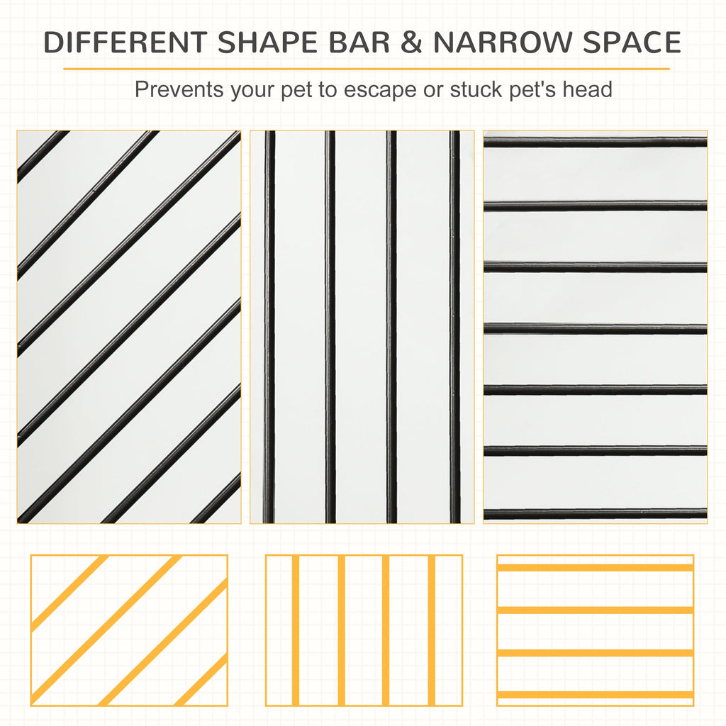 SECURE ENCLOSURE: This heavy-duty pet enclosure's bar are arranged differently and space is narrow. The front is a vertical row of bars, the right and the back diagonal row of bars, the left horizontal row of bars, not easy for your pet to escape. The steel frame keeps your pets secure inside.
