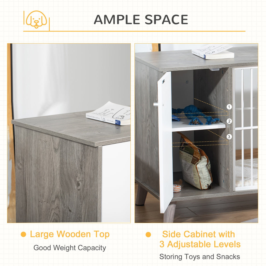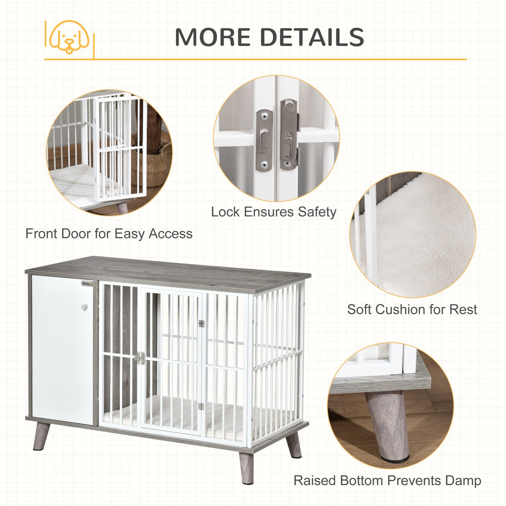 A secure PawHut cage fused with a side table – your dog has a comfortable spot to rest, whilst you have a spacious top to display your favourite pieces - it also features a cabinet to store toys and snacks. Your pet will be snug, as they rest on the soft and washable cushion, whilst the raised base stops damp and cold seeping through. They'll have a front door for easy access and there's a lock, so your pet will remain put. Made from particle board and steel, it's durable and can be used daily.