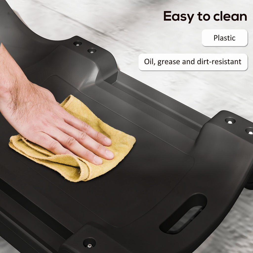 Ensure your comfort at all times during under-car maintenance with DURHAND creeper. Made from rugged plastic for long-term use, it features an ergonomic design that conforms to your body shape, with a thickly padded headrest for support and to prevent strain. Equipped with a carry handle for easy transport, two tool trays on each side for convenient access and six multi-surface caster wheels for smooth movement, this creeper is great for getting solo jobs done efficiently and comfortably.