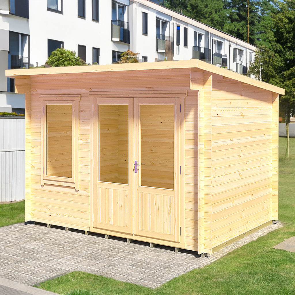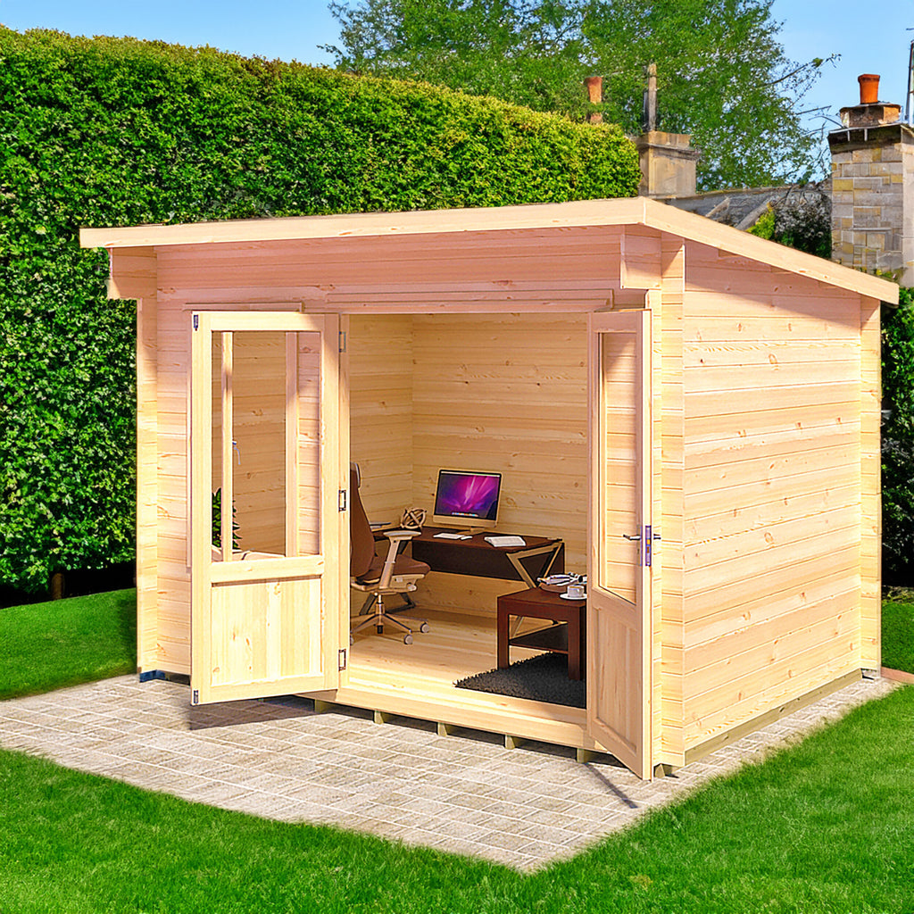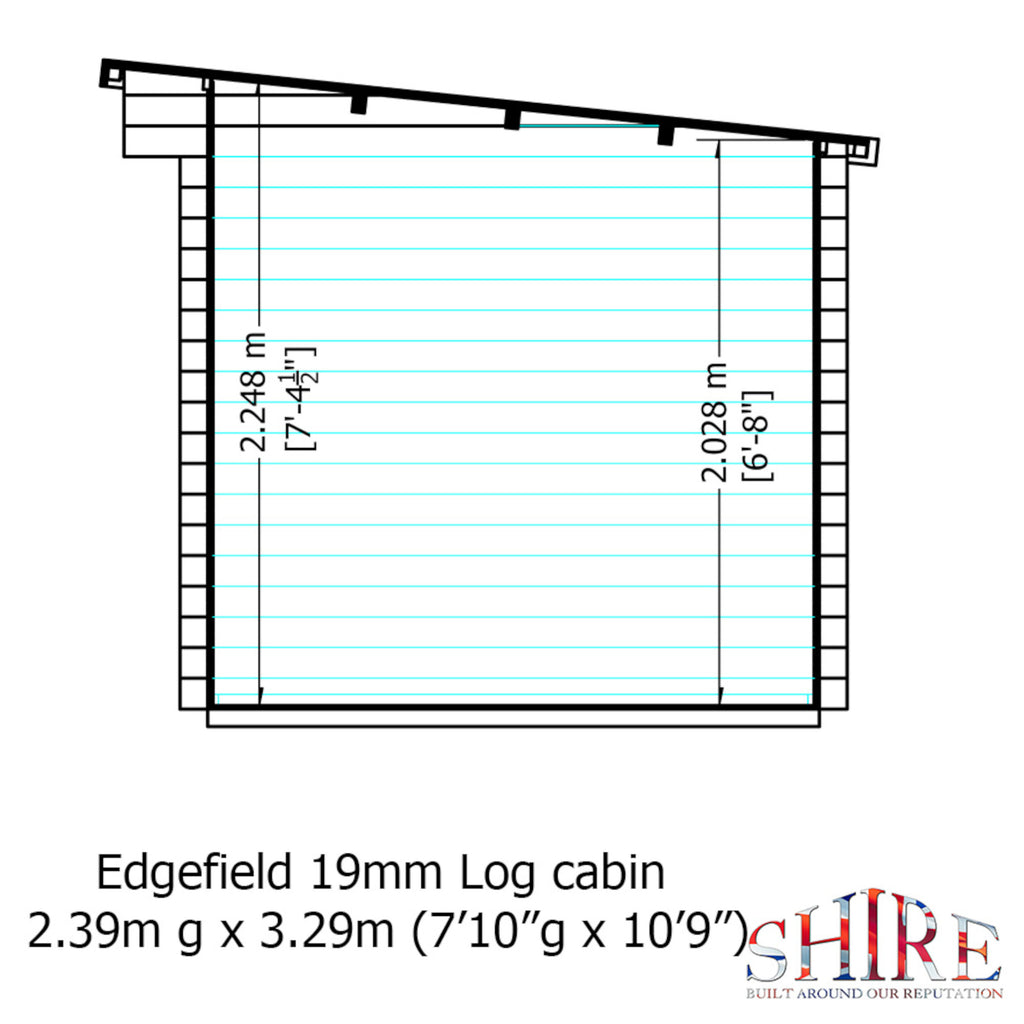The Edgefield is a very popular choice with it's contemporary good looks! A robust log cabin, it has lockable, glazed double doors and a matching joinery quality, opening, glass window. The cabin comes with a tongue and groove roof and floor with pressure treated bearers. The double door and opening window positions are interchangeable. The interlocking timbers that make up the walls of the building are 19mm thick, some 50% thicker than a normal garden building. The building is supplied untreated ready for you to paint or stain immediately after assembly. Where dimensions are critical please check internal (floor) sizes as building dimensions are to the edge of the individual boards that make up the cabin and will include the crossover of the logs. Internal eaves height is over 6' (1825mm) for a really spacious interior. Please note that log cabins are supplied as individual log boards that are assembled length by length, building up from the floor; not pre-made panels.
