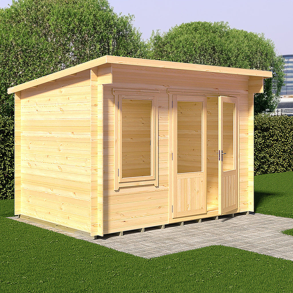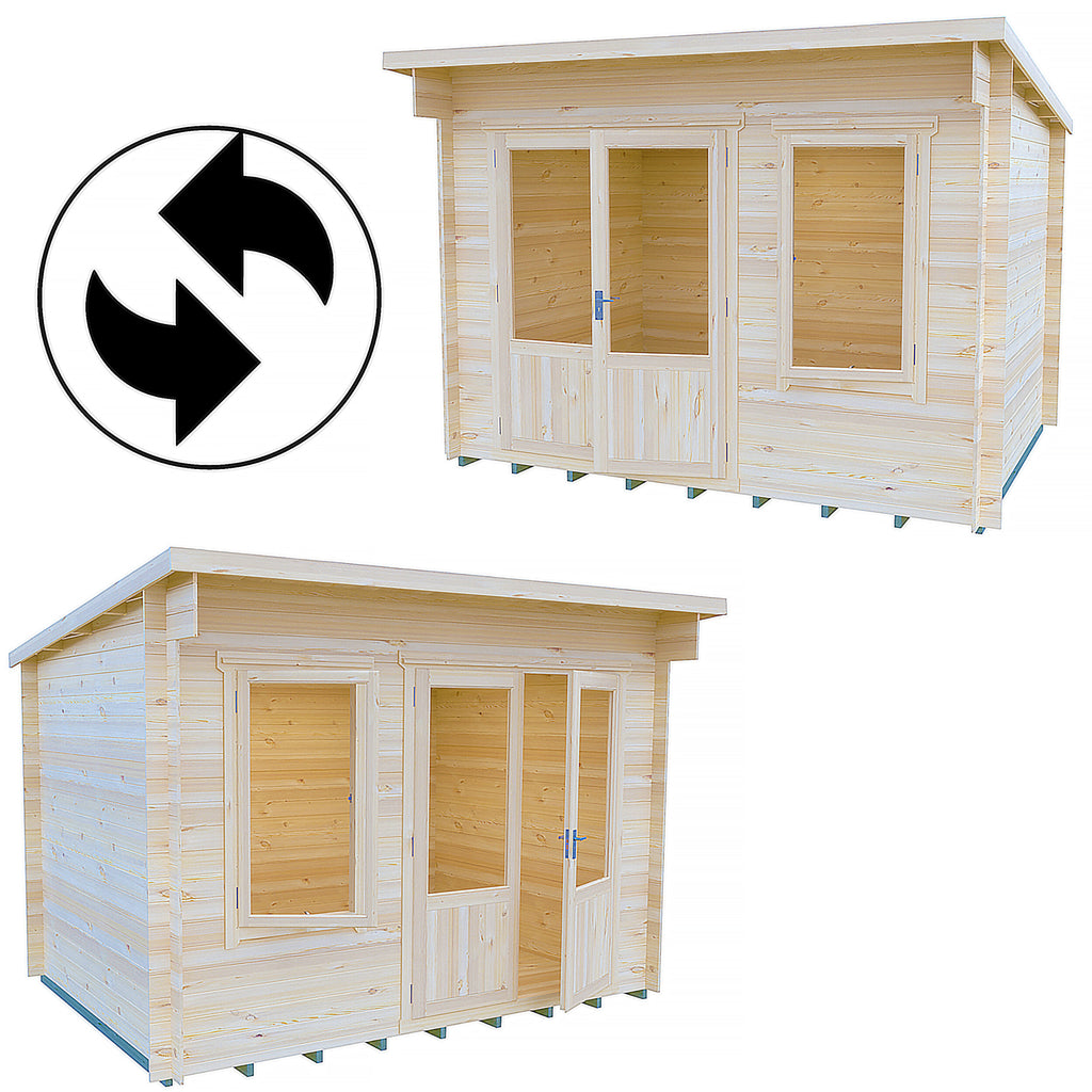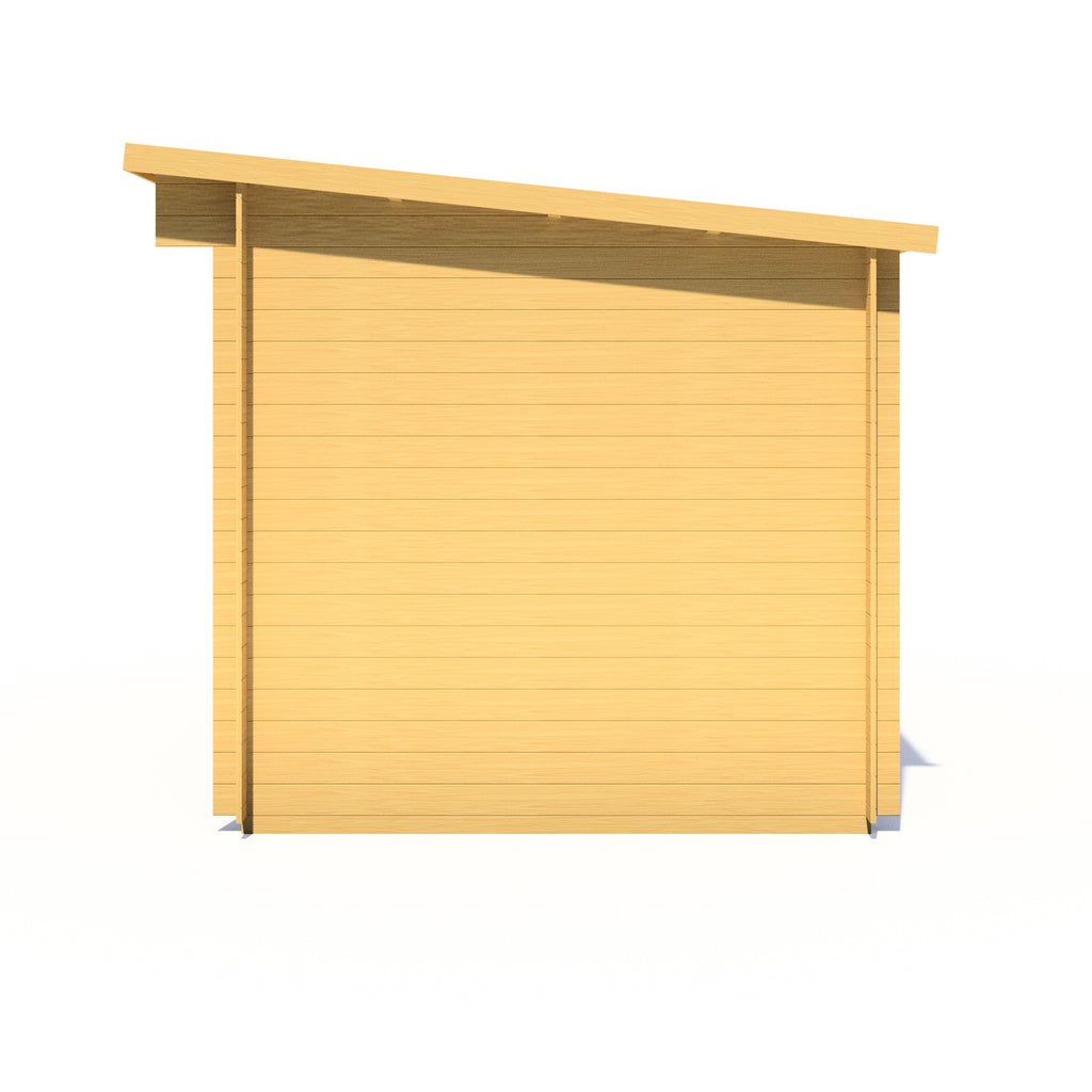 The Edgefield is a very popular choice with it's contemporary good looks! A robust log cabin, it has lockable, glazed double doors and a matching joinery quality, opening, glass window. The cabin comes with a tongue and groove roof and floor with pressure treated bearers. The double door and opening window positions are interchangeable. The interlocking timbers that make up the walls of the building are 19mm thick, some 50% thicker than a normal garden building. The building is supplied untreated ready for you to paint or stain immediately after assembly. Where dimensions are critical please check internal (floor) sizes as building dimensions are to the edge of the individual boards that make up the cabin and will include the crossover of the logs. Internal eaves height is over 6' (1825mm) for a really spacious interior. Please note that log cabins are supplied as individual log boards that are assembled length by length, building up from the floor; not pre-made panels.