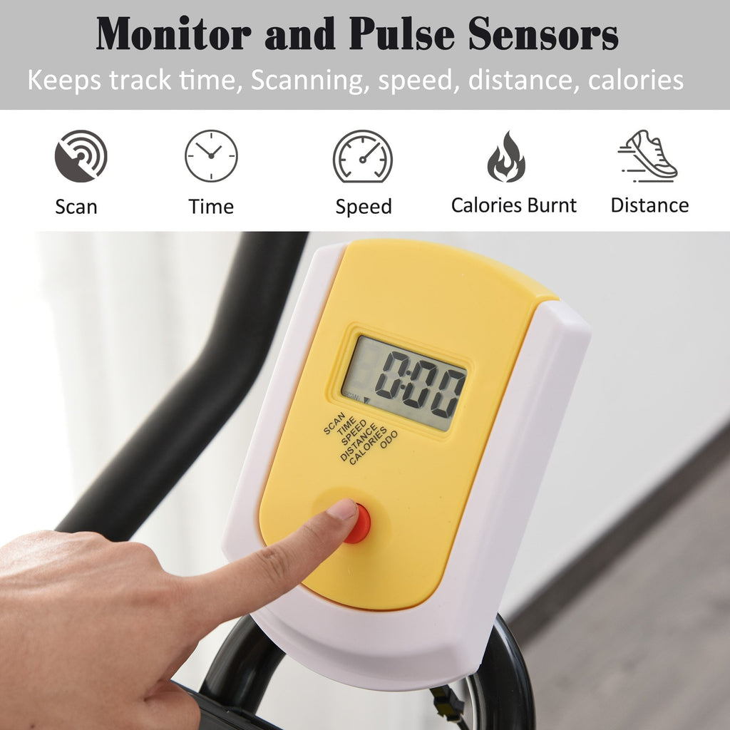 Improve your fitness and start achieving your goals at home with this HOMCOM stationary exercise bike. Its upright design stands steady, with the two wheels allowing it to be moved easily for storage. It features a resistance knob so you can change up the intensity to suit you. The included LCD display displays the time, speed, distance and calories burnt, keeping you on track as you work out. Using heavy-duty steel with belt-driven system and 6kg flywheel, this fitness bike keeps stable and balanced when in use. A fun way to work out your upper and lower body, getting your body moving around. 2 x AAA batteries required, not included.