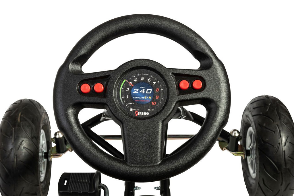 Conquer any backyard terrain with the rugged Ferbedo Go-Kart AT X-Racer! This robust pedal go-kart is built for adventure, featuring a strong steel frame in a sporty black and yellow design, perfect for young drivers aged approximately 3 to 8 years. The high-quality pneumatic tyres provide excellent grip and cushioning, ensuring a comfortable and controlled ride on various surfaces, from smooth paths to bumpy lawns ? truly living up to its All-Terrain potential. The Ferbedo AT X-Racer Go-Kart grows alongside your child, thanks to the easily adjustable seat ensuring optimal pedalling position. It boasts Ferbedo's convenient automatic freewheel system, allowing for safe coasting without spinning pedals and easy switching between forward and reverse drive. The handbrake provides reliable stopping power when needed.