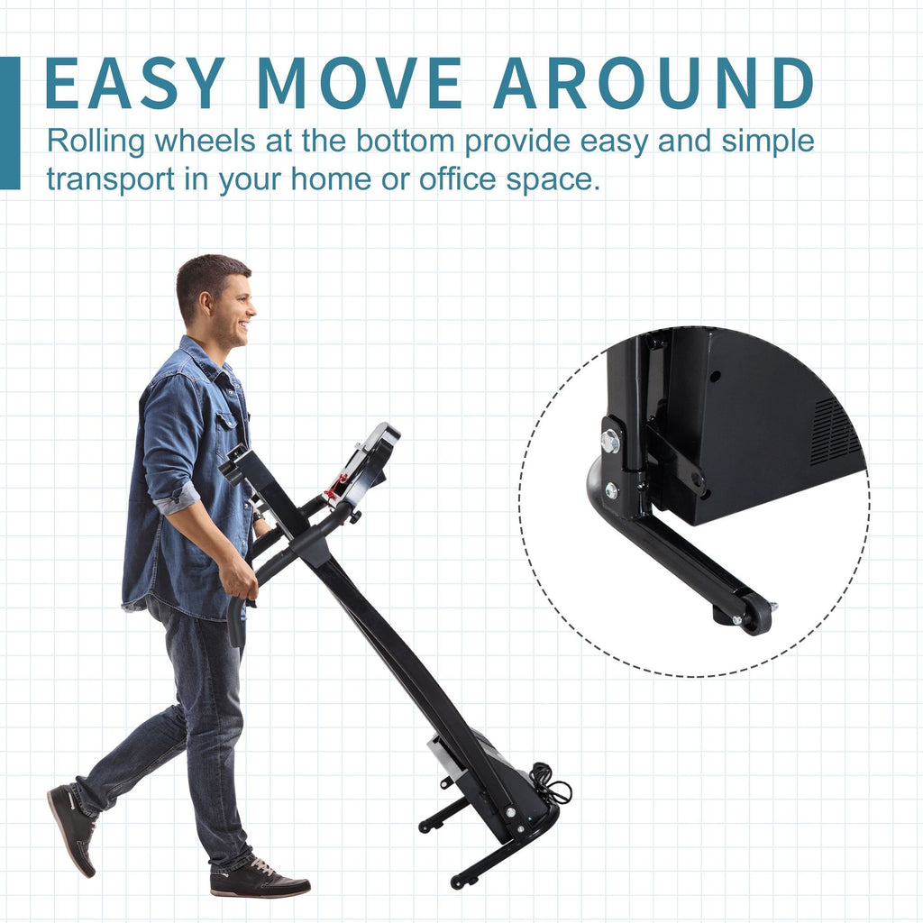 • PORTABILITY DESIGN: This foldable motorized treadmill is in portable size and with 2 small wheels for easy move around, you can use this running machine wherever you want, which is space saving and easy transport.