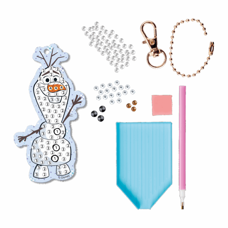 The process is simple and relaxing. Just peel back the protective film, use the special tool and wax to pick up the colourful gems, and place them onto the self-adhesive Olaf template, following the guide. Once youâ??ve covered the design in sparkly â??diamondsâ?, your unique keyring is ready to be attached to your bag or keys.