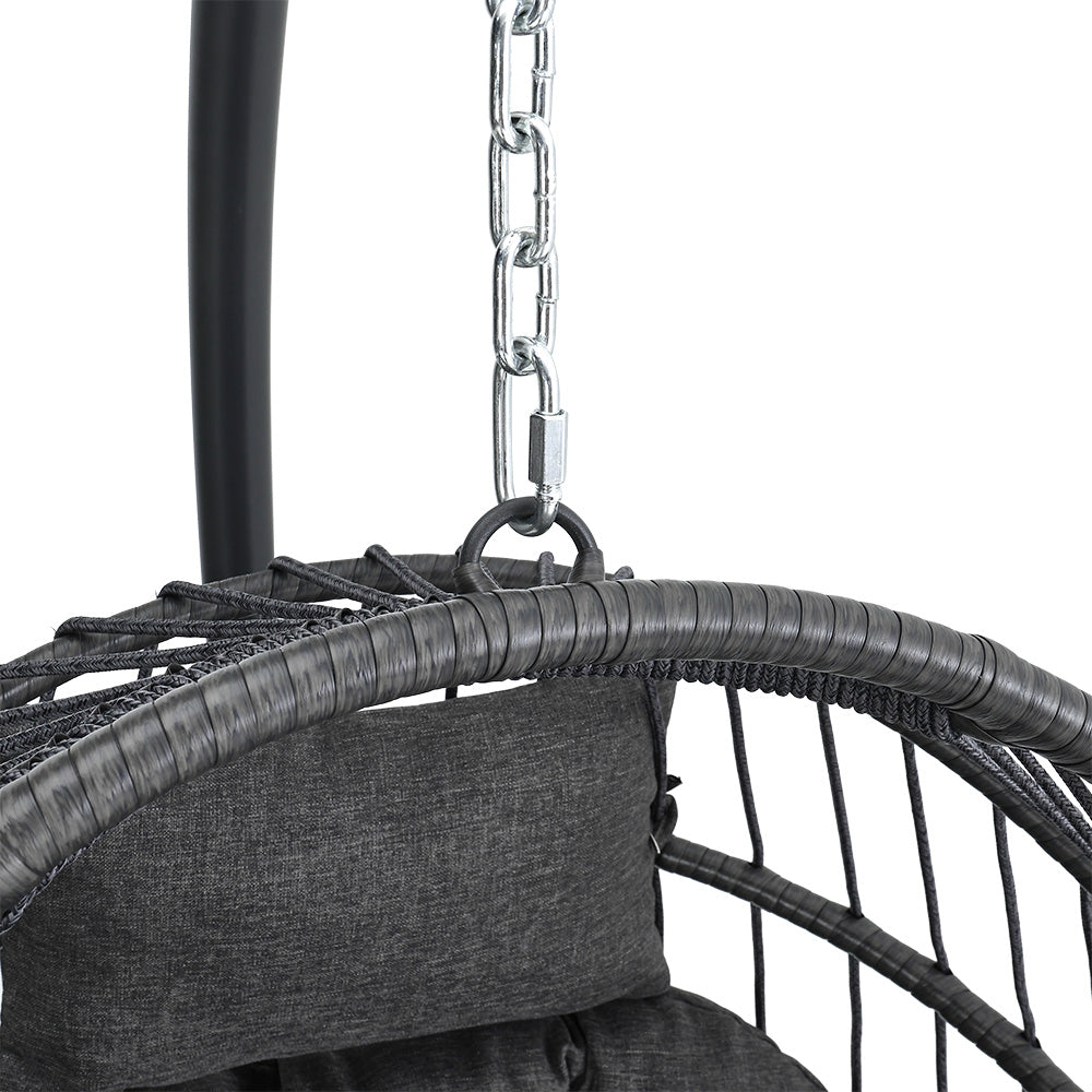 The Garden Sanctuary hanging chair with stand is ideal for basking in the sun and enjoying a leisurely afternoon. It comes with a soft padded cushion and a headrest, allowing you to relax in comfort for hours. The frame is fully wrapped in rattan, lending a rustic charm that effortlessly enhances both indoor and outdoor spaces.