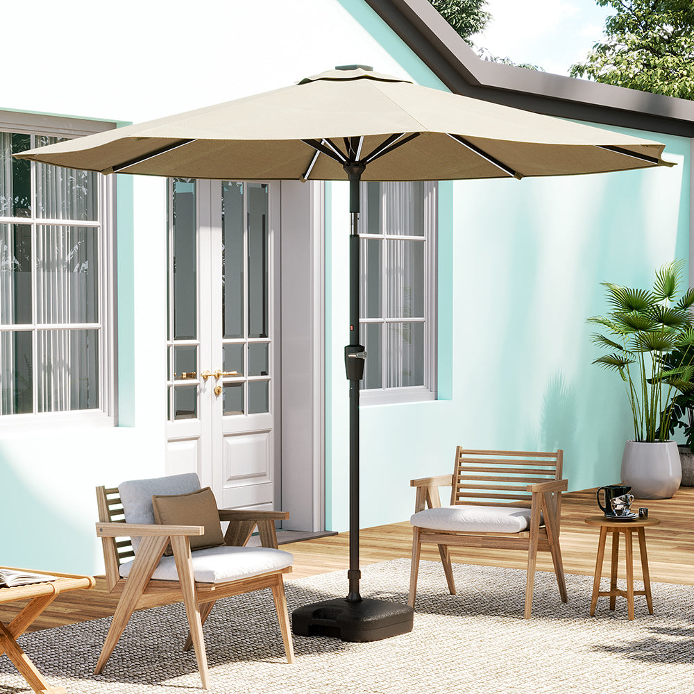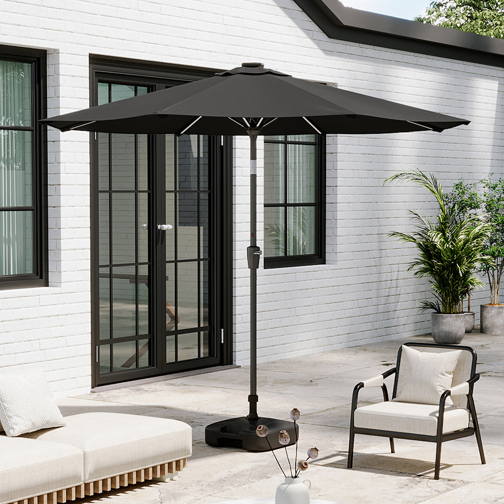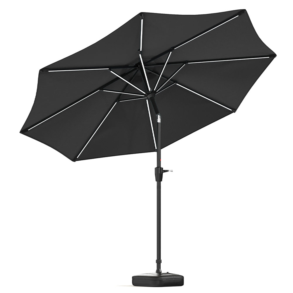Bringing a touch of holiday charm to your garden, this elegant parasol is designed to make your outdoor moments even more enjoyable. Its user-friendly crank handle allows for easy opening and closing, while the manual tilt function ensures flexible shade coverage throughout the day. As night falls, the integrated LED strips cast a warm glow, creating a tranquil and inviting setting. The included plastic base can be filled with either water or sand, offering additional stability and peace of mind.