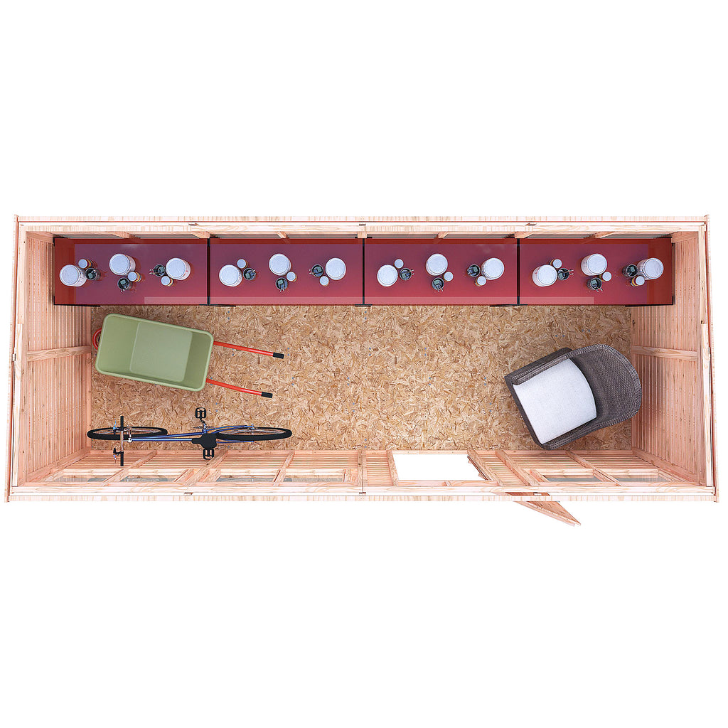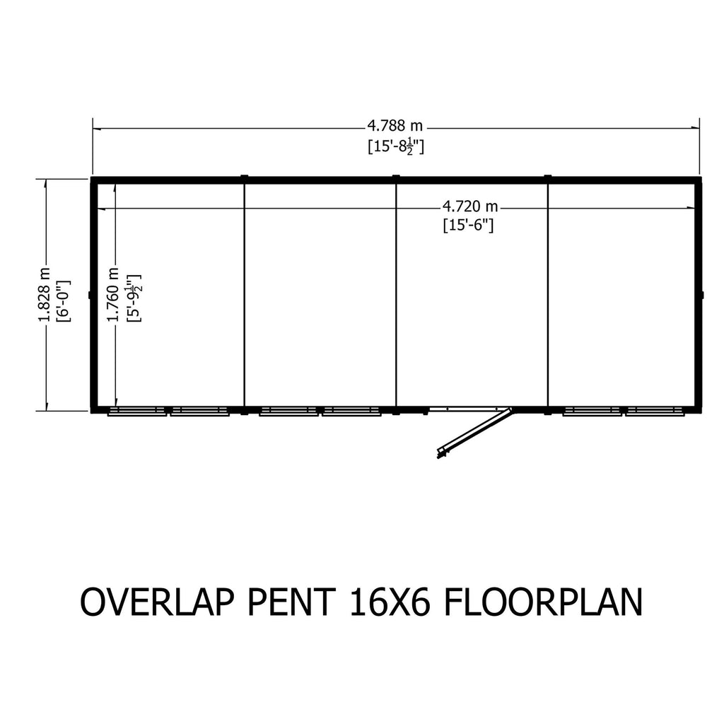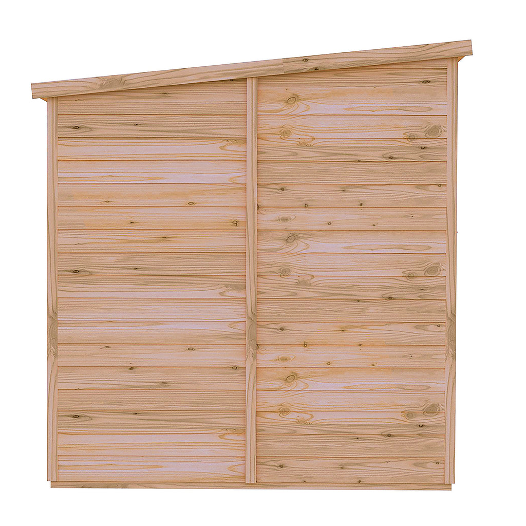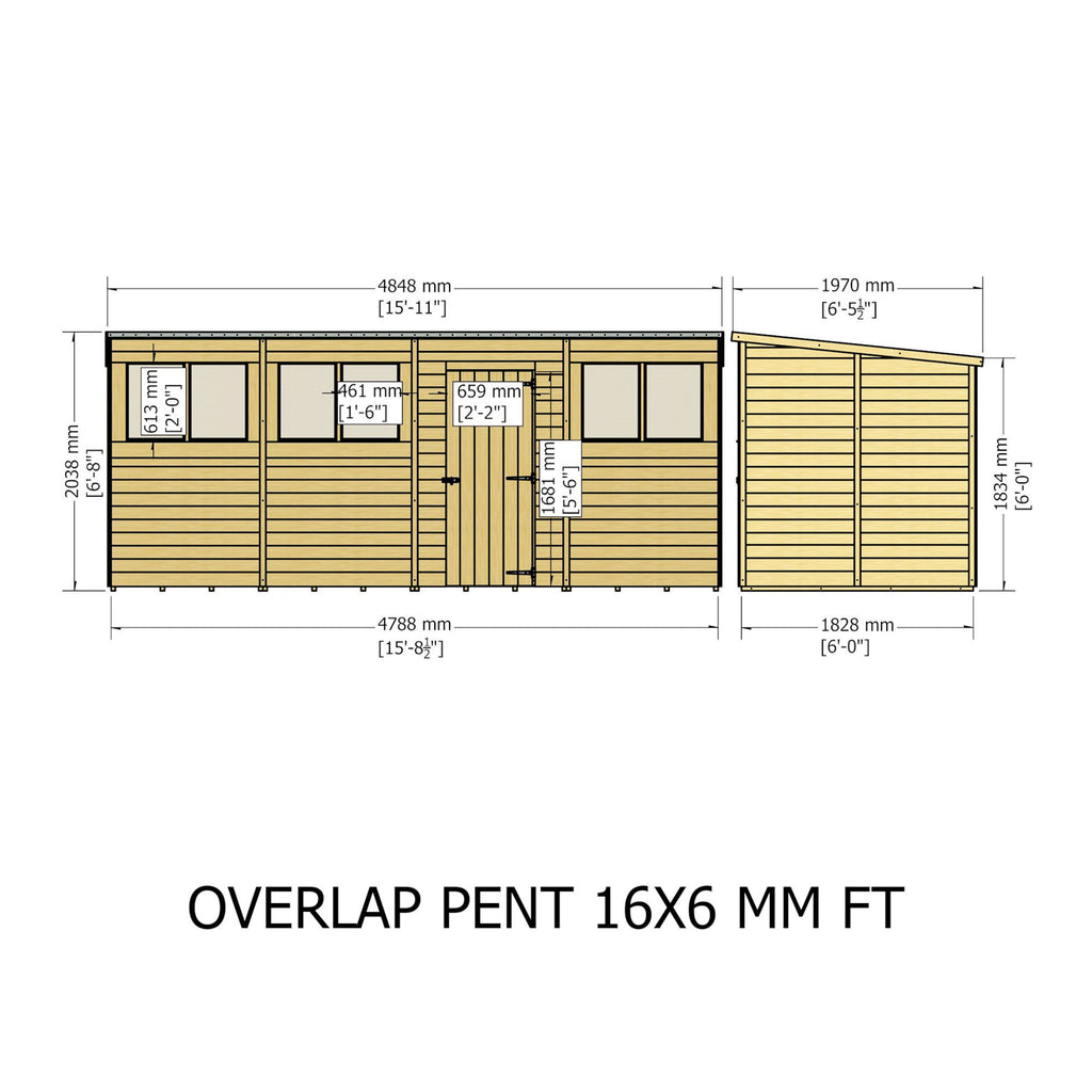 This Pent shed is a very practical design and manufactured from high grade, slow grown, FSC approved, North European pine overlap cladding boards over sturdy 34mm square framing with OSB roof and floor. With interchangeable fixed, acrylic windows and large single door. Door comes with padbolt ready for your own padlock. Dipped base coat preservative ready for you to top coat.