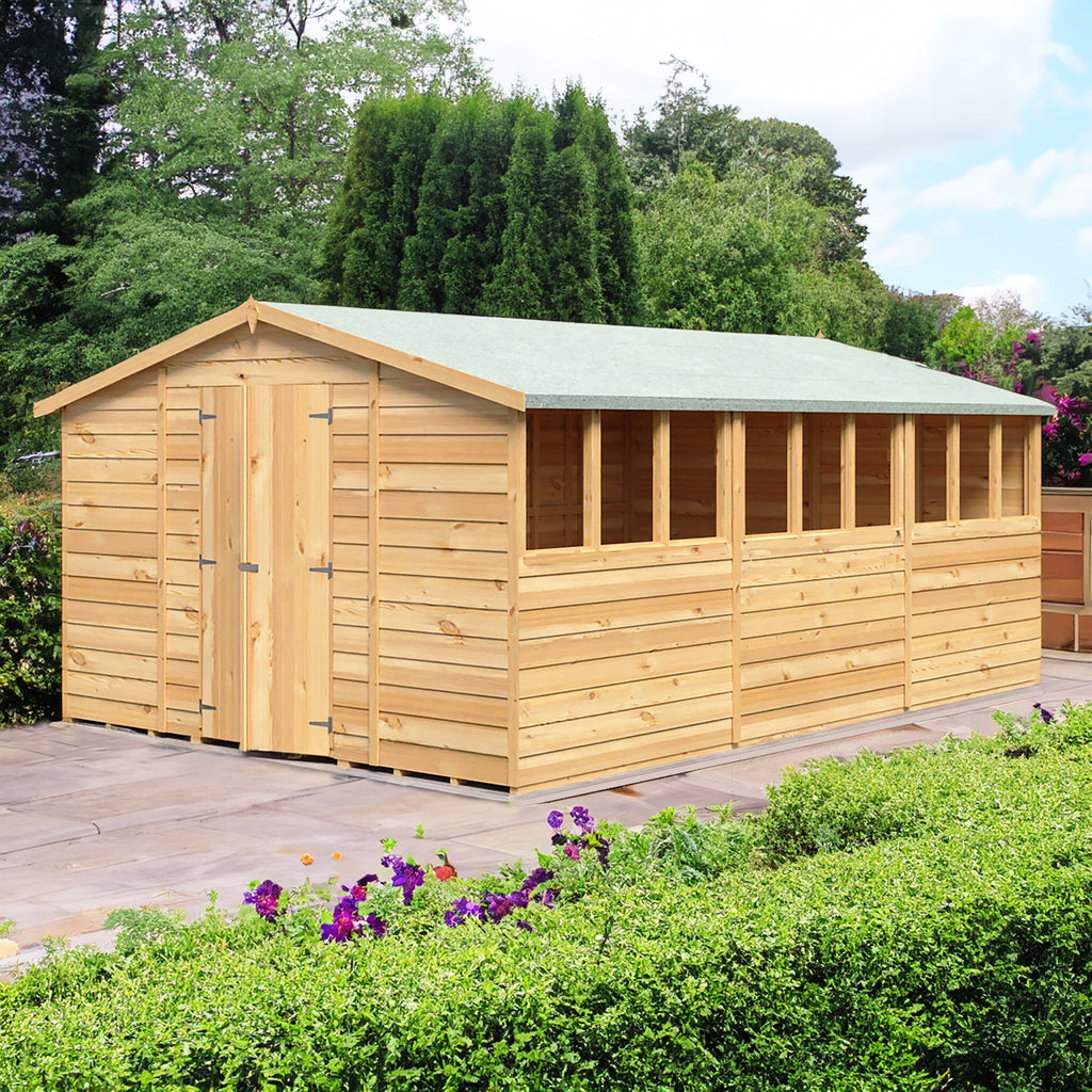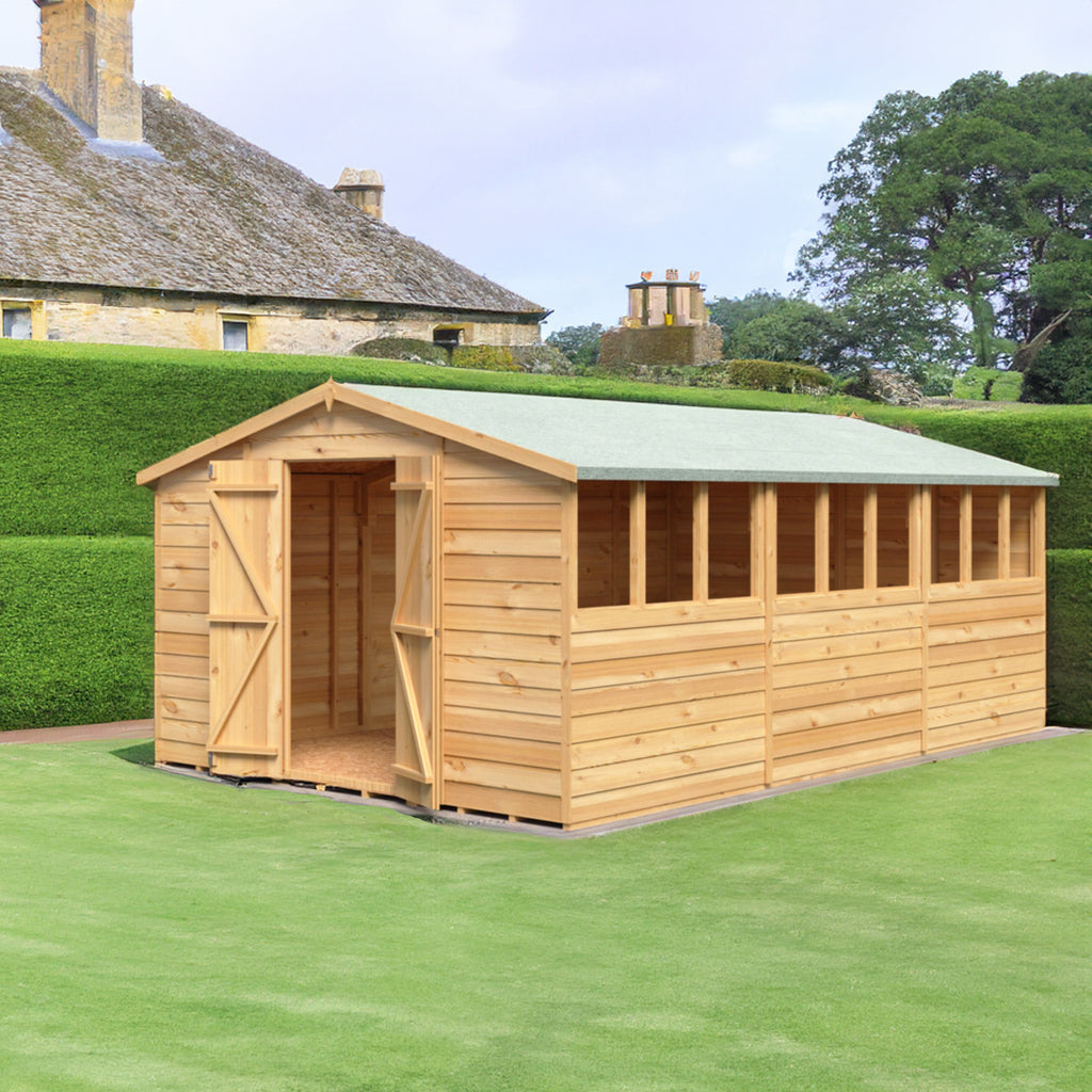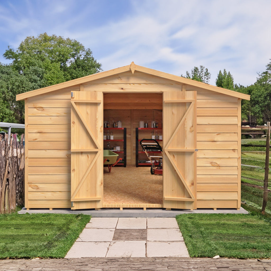 Part of our Garden Value range of overlap sheds. Double doors provide easy access to the entire space, with hasp & staple ready for your own padlock.. This handy shed is manufactured from high grade, slow grown, FSC approved, European pine cladding boards over 34mm square framing with OSB roof and floor. With nine fixed, acrylic windows that can go either side. Dipped base coat preservative ready for you to top coat.