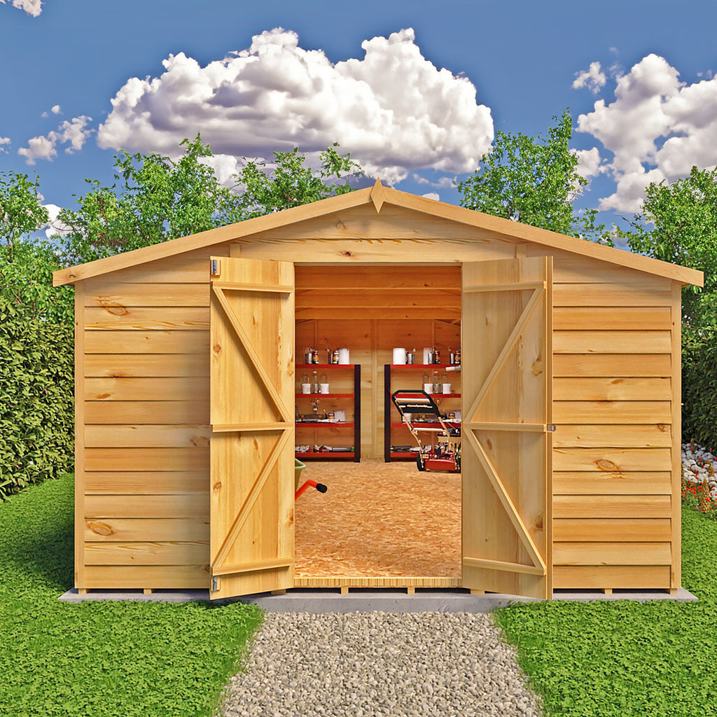Part of our Garden Value range of overlap sheds. Double doors provide easy access to the entire space, with hasp & staple ready for your own padlock.. This handy shed is manufactured from high grade, slow grown, FSC approved, European pine cladding boards over 34mm square framing with OSB roof and floor. With twelve fixed, acrylic windows that can go either side. Dipped base coat preservative ready for you to top coat.