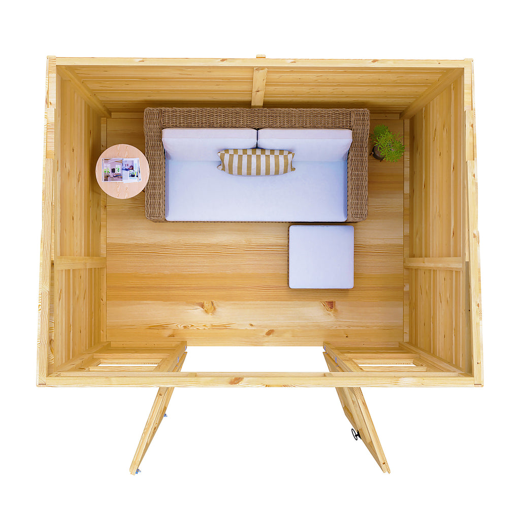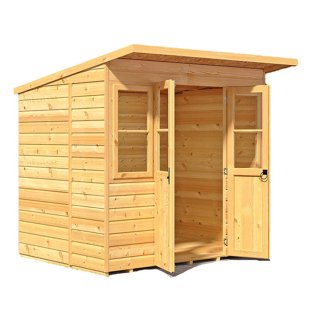 A great value Summerhouse designed to give years of service, the Haddon has a multitude of uses. The practical, joinery quality, glass glazed double doors feature a traditional gate latch. There are two opening windows. It is constructed on sturdy 34mm square framing and clad with planed shiplap tongue and groove boards made only from the highest grade, FSC approved, slow grown northern European pine with OSB roof and T&G floor. Dipped base coat preservative ready for you to top coat.