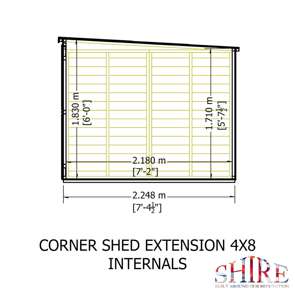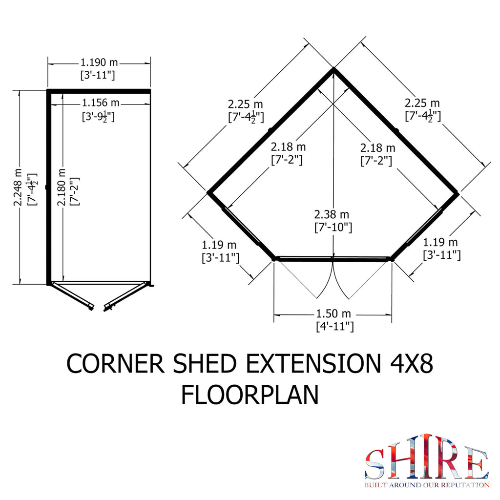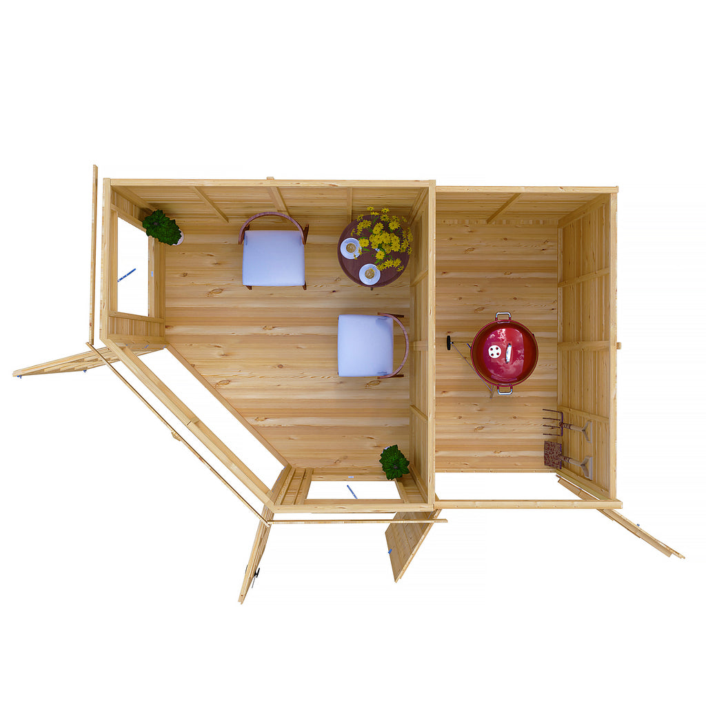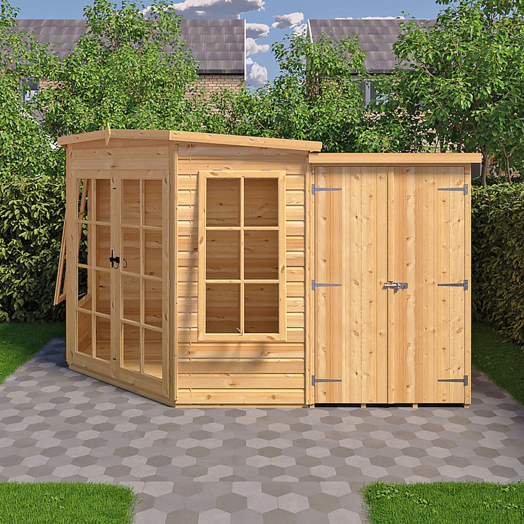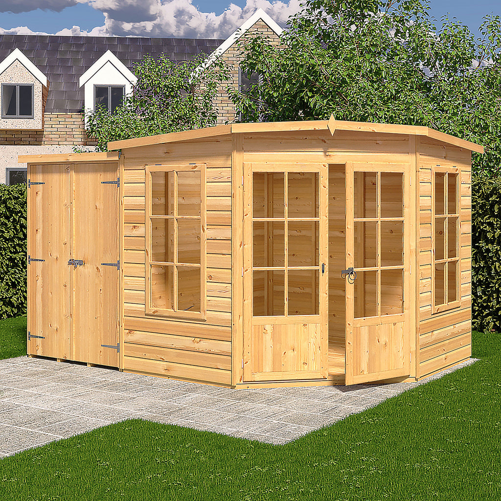 The Hampton summerhouse is a superb way of making the most of what can be a boring part of the garden or patio! Designed to fit neatly into the corner, the Hampton gives you a beautiful garden room with the added bonus of a separate storage shed, the shed can go on either side of the summerhouse. The summer house has two, joinery quality, opening windows and fully glazed, large double doors allowing plenty of light; all glazing is glass. The building is constructed on 34mm square framing and clad with planed 12mm Shiplap tongue and groove boards made only from the highest grade, slow grown, FSC approved northern European pine. The roof and floor are tongued and grooved timber. The shed door has a padbolt to the door and the summerhouse features a traditional gate latch. Dipped base coat preservative ready for you to top coat.