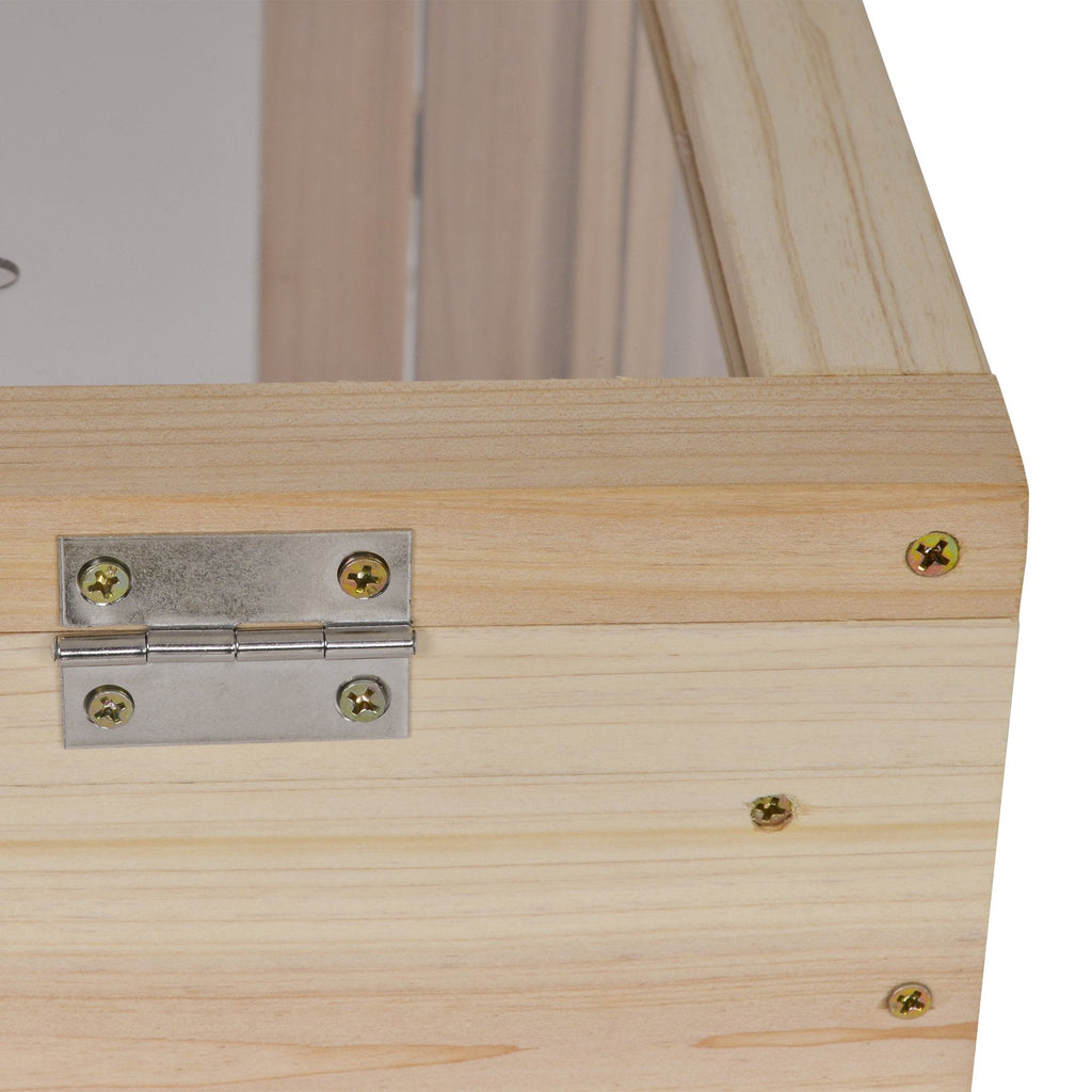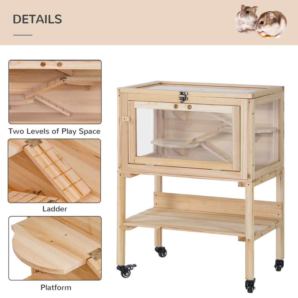 Specification: - Material: Fir wood, PS organic glass. - Colour: Natural Wood. - Overall Dimension: 60L x 36W x 80.5H cm. - Glass Door Size: 49.5L x 26H cm. - Main Socket Dimensions: 56L x 33W x 32H cm. - Each of Platform: 21.8L x 12W cm. - Each of Ladder: 16.4L x 6W cm. - Storage Racks Size: 53L x 32W x 21H cm. - Custom Label: D51-173. PERFECT HAMSTER CAGE: This large rodent cage is made of fir wood. Lift the leg to protect the dwarf hamster cage from moisture. Four sides of PS glass window design allows you to see your pet at all times. It's a good home for hamsters, syrian or dwarf hamster, mice, guinea pig, gerbils and other small animals PLENTY OF PLAY SPACE: Large play areas at the bottom level of this mouse cage, with different platforms and ramps. It can be used for exploration and climbing. Lots of fun for little pets. STORAGE RACK: the lower layer for storage, can store toys, food, chew toys and bowls. EASY TO CLEAN: Features openable hinged top and a front door, this rat cage is easy to clean and maintain. EASY TO MOVE: The legs of hamster cage for dwarf hamster are equipped with four 360° rotating smooth rolling casters, which can easily move this large small animal cage. 2 with brakes for added safety. DIMENSION: Overall Dimension: 60L x 36W x 80.5H cm. Assembly is required.