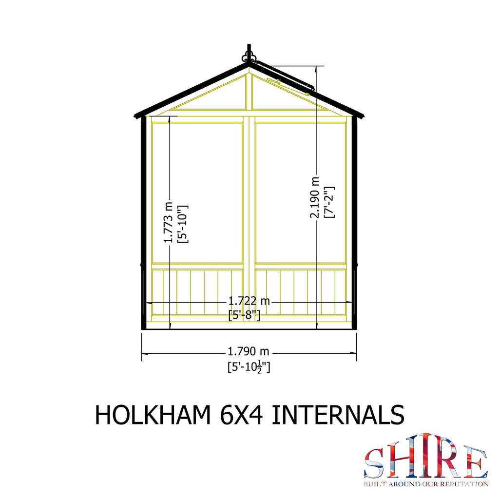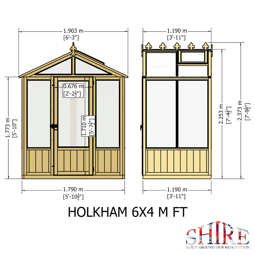 The Holkham is a stunning greenhouse available in a range of sizes to suit everyone. A wooden greenhouse has many advantages for gardeners and will also provide you with a relaxing environment to potter in. Featuring Shire's quality joinery, 34 x 58 mm framing and completed with an attractive finial and cresting to the roof, the Holkham is both practical as well as charming. The low wooden panels also add a very traditional detail to this lovely building. The greenhouse is glazed with toughened glass and has a single door with traditional gate latch handle. Roof windows have an automatic Bayliss opener supplied. The number of opening roof windows per model is, one in the 4 x 6, two in a 6 x 8, three in a 6 x 12 and four in a 6 x 16. As usual with a greenhouse, no floor is supplied and the greenhouse sits on a pressure treated base rail. No shelving or benching included. The wooden components have been dipped with a base coat preservative ready for you to top coat to your own preference.