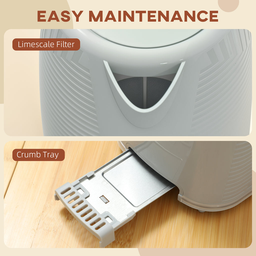 A simple, sleek addition to worktops with this HOMCOM toaster and kettle set. Gently curved, textured all over and with glowing lights, this set looks great as part of your appliance collection. The 1.7L kettle with Otter thermostat delivers fast, precise boiling, plus with safety features (auto shut-off, boil-dry and overheat protection) for peace of mind. The two-slot toaster has seven browning levels, for perfect toast every time.