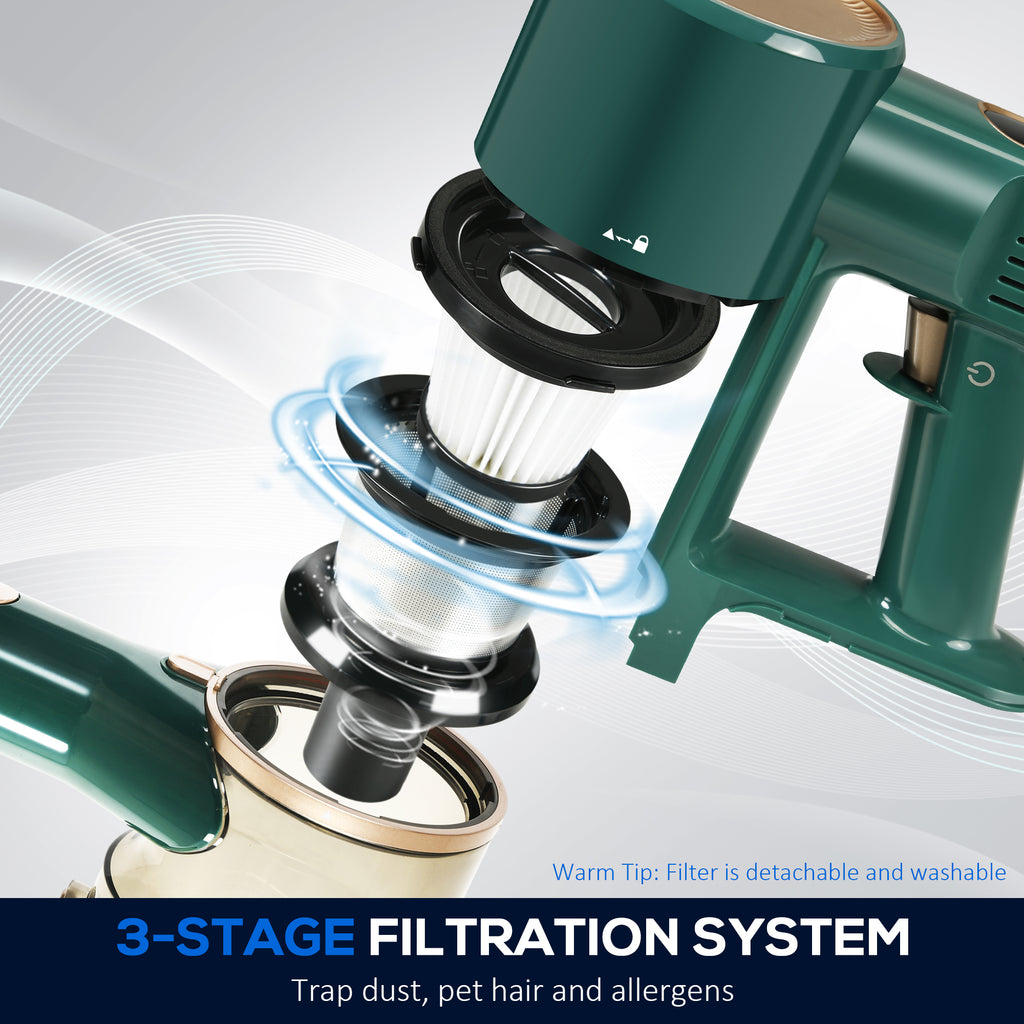 ? 3-stage filtration system traps dust, pet hair and allergens, filter is detachable and washable