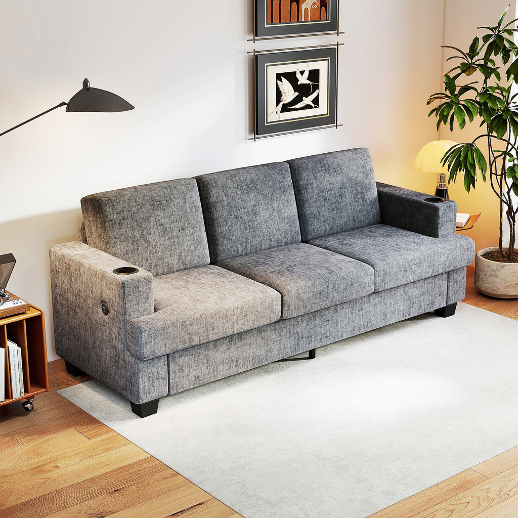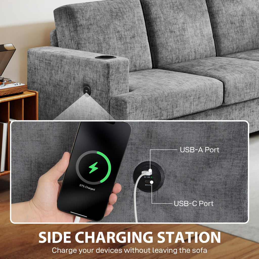 Discover the comfort of the HOMCOM three seater sofa, where convenience meets cosiness. Featuring built-in USB ports to keep your devices charged and dual cupholders for your favourite beverages, all wrapped in a soft, luxurious chenille-feel fabric. Kick back on plush cushions and enjoy the support of a robust steel frame in your living room. The fabric sofa for relaxation and style!