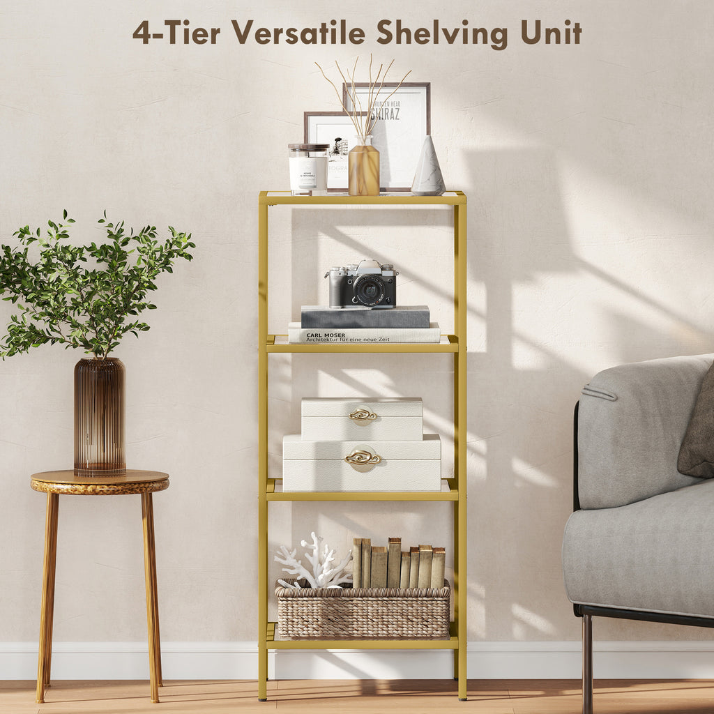 Struggling with a cluttered, compact room that lacks personality? It's frustrating when you have no space to display your favourite items. This HOMCOM shelving unit transforms your area, offering four tiers of vertical storage on a small footprint. The elegant glass and gold tone design elevates your decor, you can effortlessly create a stylish, organised home you'll be proud of.