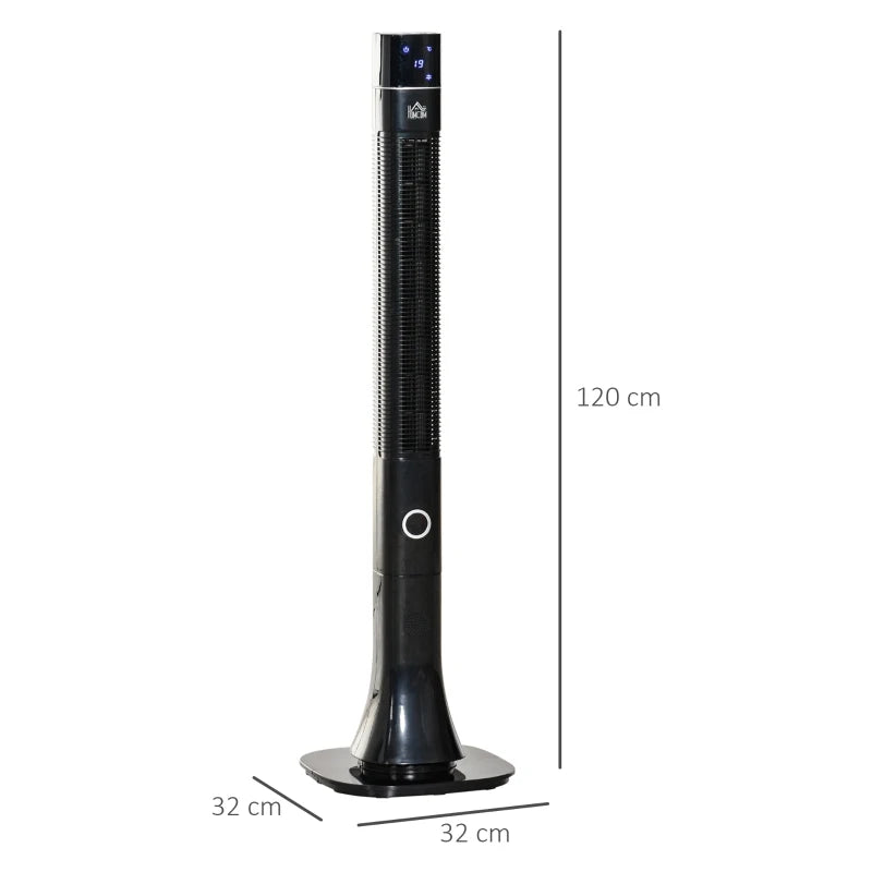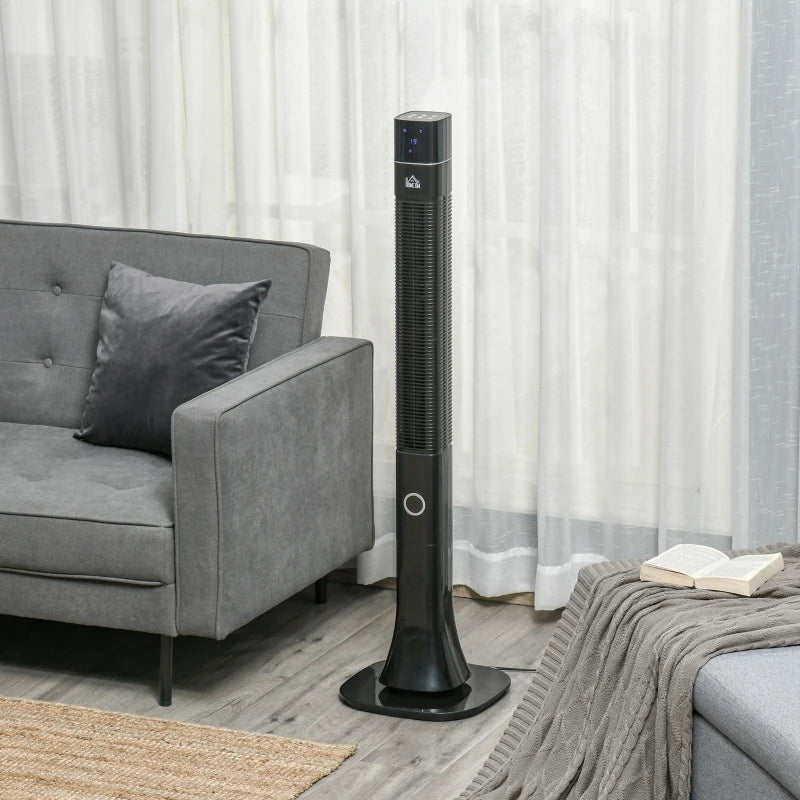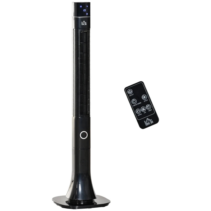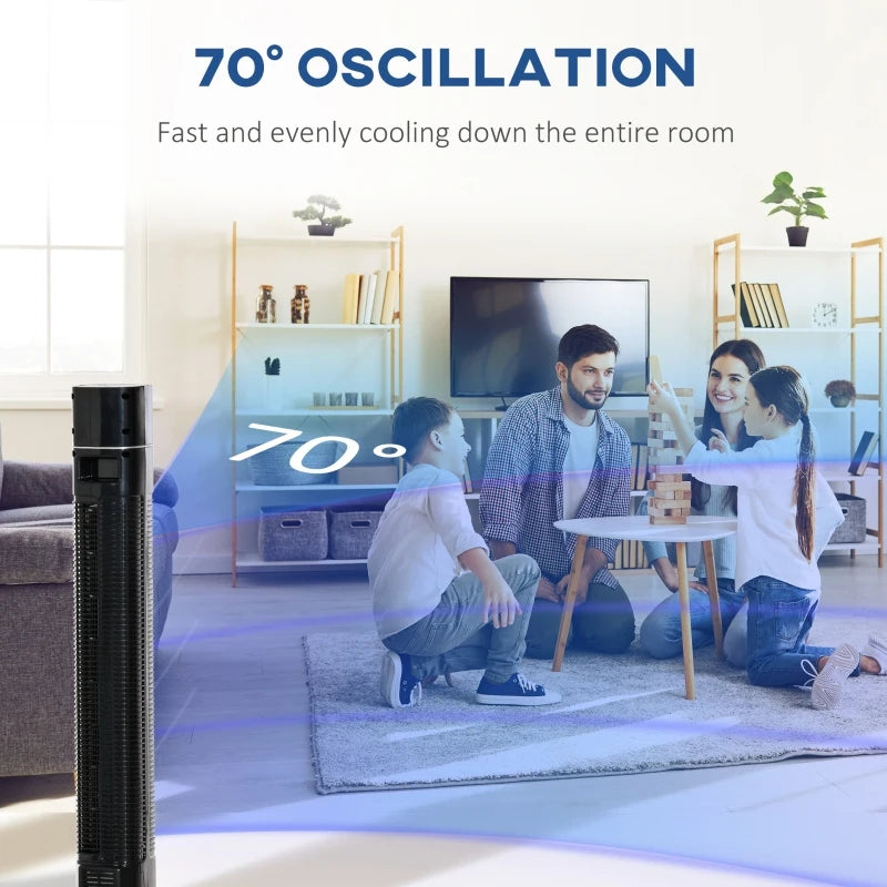 Let this HOMCOM tower fan keep you cool anytime - whether day or night. Between the low/medium/high speed setting and normal/natural/sleep mode - it's easy to set up the ionised air to how you desire. The standing fan features an LED panel for control, which also displays the temperature. Oscillating fan, with tall design, moves in a 70° range, keeping a large area cool. 12-hour timer allows you to set a specific time - ideal for hot summer nights. Comes complete with a handy remote control.