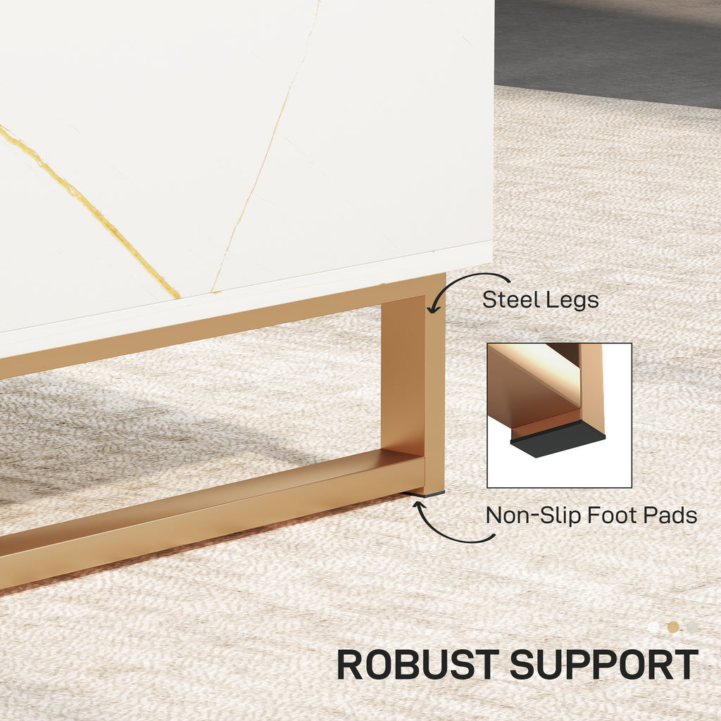 Thanks to the marble-inspired design of this HOMCOM living room coffee table, paired with the gold tone accents, this is an elegant piece for your living space. The modern coffee table has a drawer and large shelf, with a smaller shelf on the other side complete with steel legs for lots of support.
