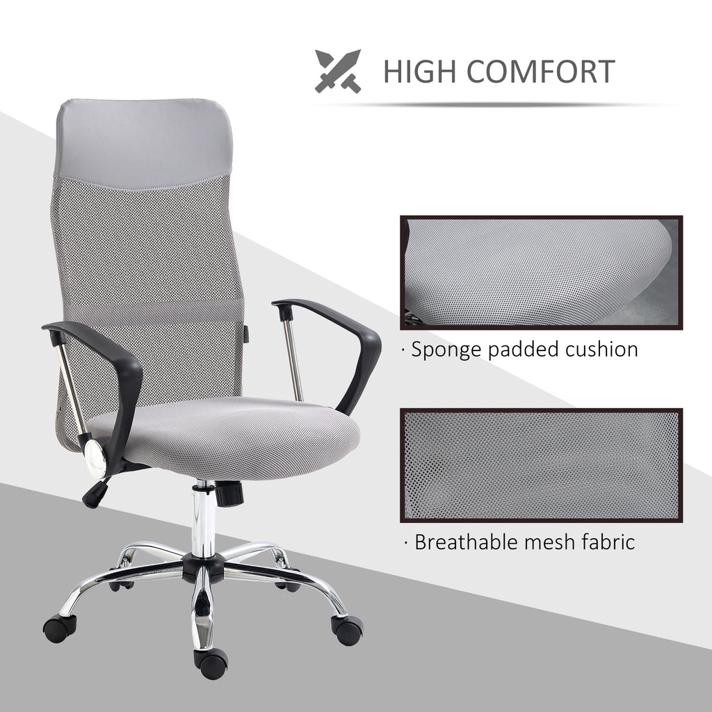 Introducing the HOMCOM mesh chair, a combination of style and comfort. This chair boasts adjustable height, swivel function, a padded seat, high back, and armrests, ensuring optimal support and comfort. Its main mesh material is complemented by a sleek faux leather top panel for a modern touch. Achieve the perfect seated position by adjusting the seat height to match your desk level. The chair is also equipped with five wheels for easy mobility.