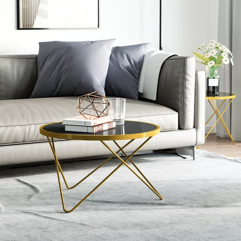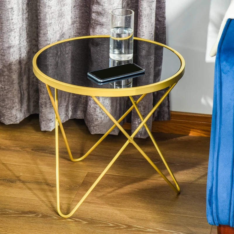Be bold and daring with your home furnishings this season: bring this standout coffee table, from HOMCOM, into your home or office space. It combines a gold-tone frame with a black top, allowing both colours to contrast and complement each other beautifully. The frame, made from steel for strength, is fitted with crossed-hairpin shaped legs for balance. Glass table top is flat so you can hold everything, smooth to touch so it wipes clean easily.