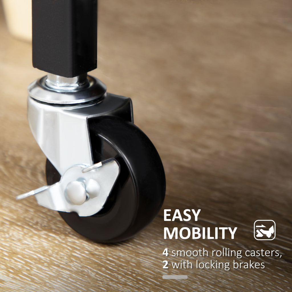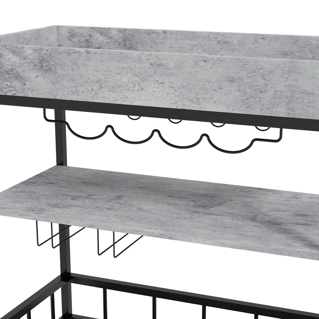 Maximise kitchen storage space - get organised with this HOMCOM trolley on wheels. Comes with bottom tray, middle shelf, top removable tray, a four-bottle rack and two three-glass stemware racks: plenty of room for keeping plenty together. It features a removable tray on the top - carry items without having to move the whole trolley. Look to the marble-style panels for an industrial edge. Bar cart is complete with four wheels to move easily - two with brakes.