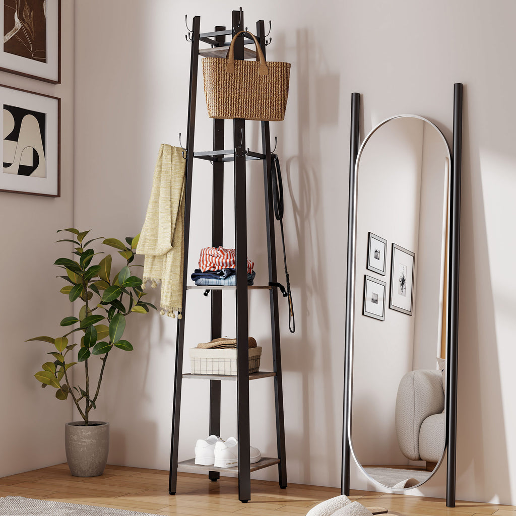 Struggling to keep coats and bags organised in limited space? The HOMCOM coat rack brings order and style to your entryway. Its tower-like frame fits effortlessly into corners or narrow hallways, while eight triple-prong hooks and four shelves keep coats, bags and hats neatly organised. The HOMCOM coat stand with matte black metal and wood-effect shelves adds an industrial charm that blends beautifully with any interiorsâ??making your home both functional and stylish.