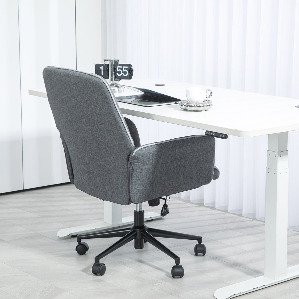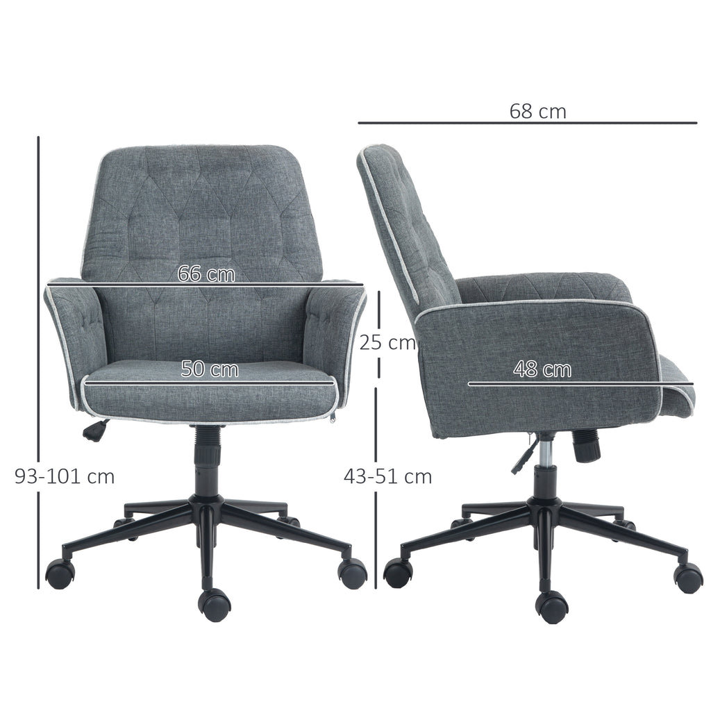 This HOMCOM office chair proves that functionality doesn't mean sacrificing style. With the adjustable height, swivel seat and five wheels, this chair works with your body as you work. Relaxed lines, button tufting and linen-look upholstery for plenty of style. It's fitted on a steel base for support.