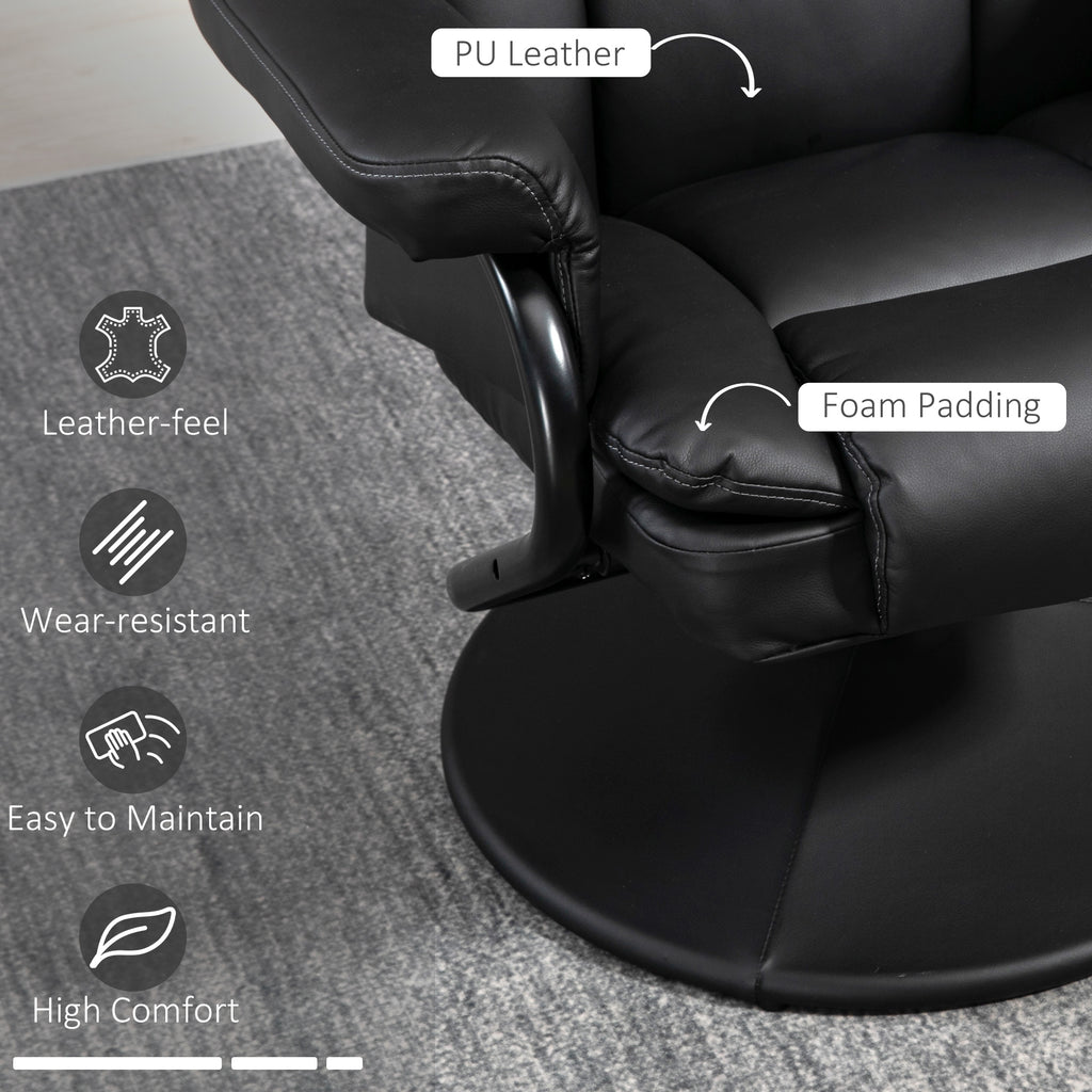 Whether you're watching the big game, flipping through a magazine, or drifting off for an afternoon nap, a swivel recliner chair with an ottoman makes it easy to unwind. The high-slanted back, supportive headrest and all-over padding offer lasting comfort, while the sleek PU leather adds a refined touch. Recline up to 135° and relaxâ??after a long day or on a slow Sunday, this faux leather armchair and ottoman are just what you need.