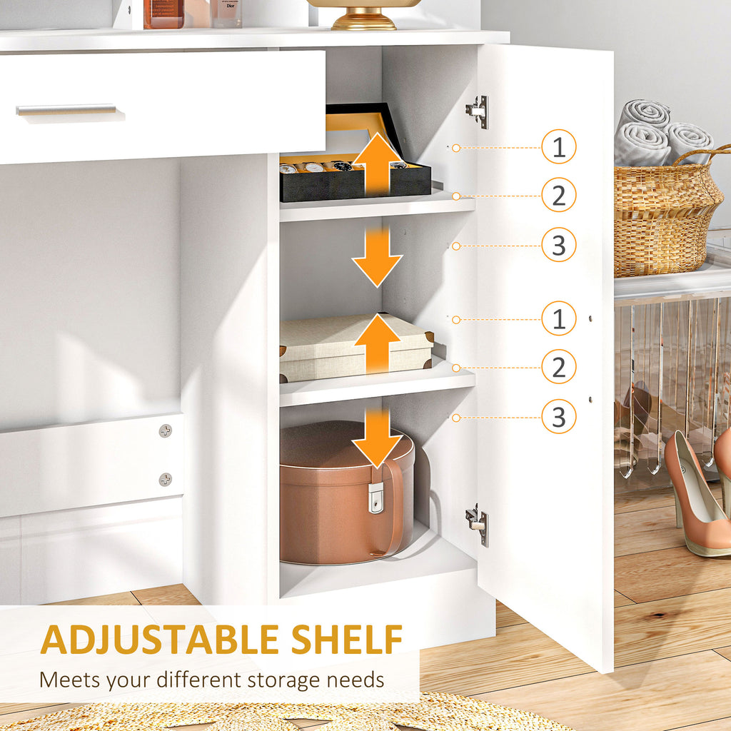 An essential for every bedroom, this HOMCOM dressing table is a space to get ready and keep all beauty essentials in a place. Not only with a large mirror, this make up desk comes with five top shelves, a top drawer and a side cupboard which comes with two three-level adjustable shelves. Makeup desk is made from particle board for sturdiness, finished with a melamine coating for smooth protection.