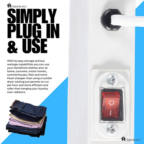 HOMEFRONT ELECTRIC CLOTHES AIRER/DRYER: No tools are needed for assembly, simply take out the box clip the legs on, plug in and use (takes seconds). Designed with the lightest of materials for easy transportation from room to room. With fold-out wing sides to give extra airing and drying capacity, holding up to 10.5m in garments or 16KGS in weight, folds down in seconds flat for easy storage.