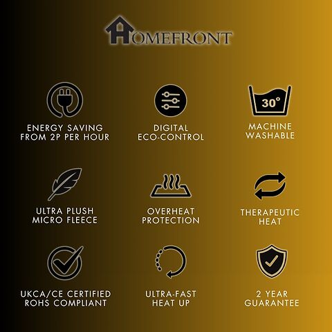 One of the most advanced heated throws / blankets on the market with 9 heat settings and 9 timer settings for you to choose from along with an ultra fast 15 minute heat up time and a user friendly, digital, detachable (for machine washing at 40°c) control. Use your Homefront Heated Throw all year round; it's perfect for helping those in particular who suffer with arthritis and circulation problems as it provides a gentle, soothing and therapeutic heat whenever you require it. All Homefront Heated Throws are CE certified and RoHS compliant to the highest UK standards with Built In Advanced Overheat Protection System and Automatic Safety Shut Off for your peace of mind.