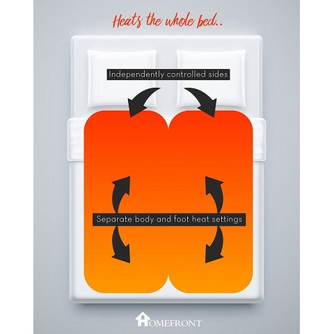 With an illuminated LCD control, 9 heat settings, 10 timer settings and an ultra fast heat up time, you can use your Homefront Premium Electric Blanket in all seasons. The controllers have Individual Body & Feet Heat Technology which help those who suffer with arthritis and circulation problems. Both controllers are detachable, allowing it to be machine washable. Durable design with a deep, elasticated skirt to ensure a secure fit to your mattress with non-obtrusive wires for an undisturbed sleep. All Homefront Electric Blankets are safe for all night use, are CE certified and RoHS compliant to the highest UK standards with Built In Advanced Overheat Protection System and Automatic Safety Shut Off.