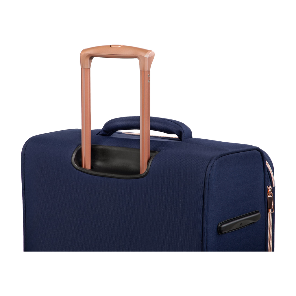 This stunning lightweight & eye-catching luggage range is a great addition to our offer. Rose gold hardware, 100% polyester and a luxurious quilted front panel.