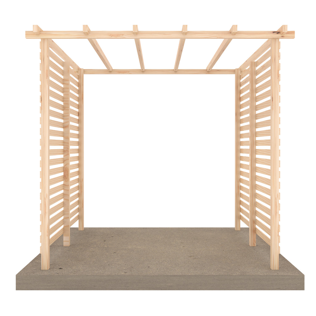 The Ivy pergola with slatted side walls is made from high quality pressure treated pine. The pressure treated finish gives a longer life with low maintenance. Posts are 70 x 70 mm, sides are 12 x 70 mm with 44 x 70 mm roof purlins. At 2.4 m high, wide and deep, the Ivy gives you a spacious feature, perfect for creating a stylish outdoor dining or seating area. Supplied in its natural finish you can apply a wood stain or paint to suit your garden and nurture the wood.