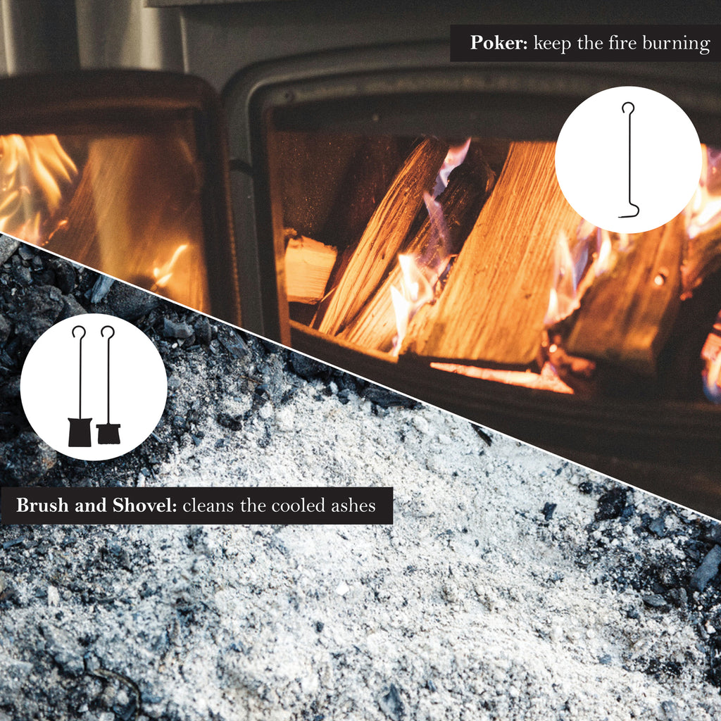 Keep your coal fire or wood burner in the best condition and use the brush to sweep, poker to help keep the fire burning evenly and the shovel for those cooled ashes
