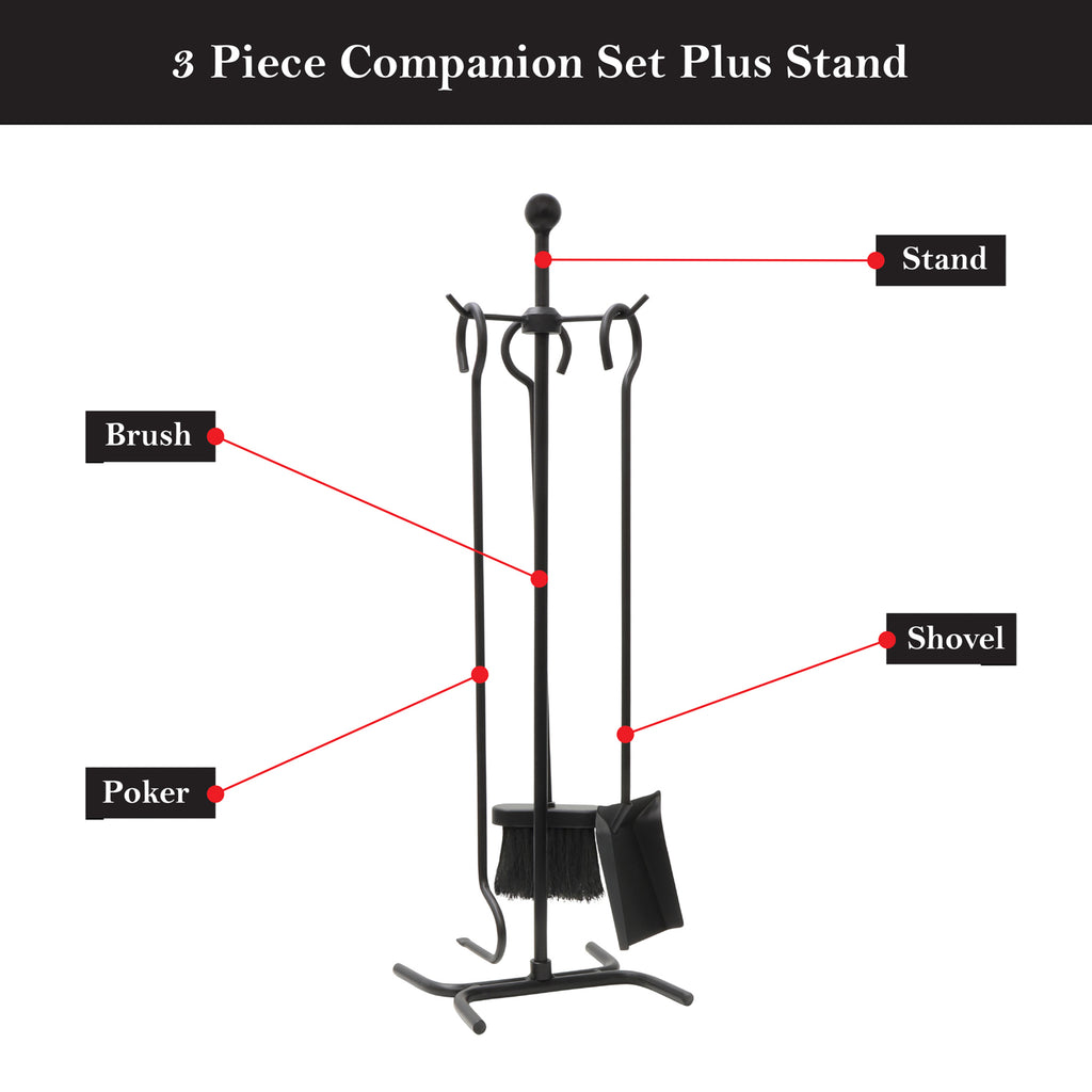 Three-piece set, plus stand, includes the following fireplace tools: poker, brush, shovel