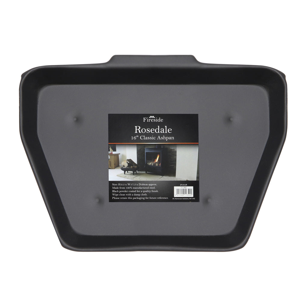 The fireplace is the heart of the home, that's why we have carefully selected a range of fireside furnishings matching function with style. The Rosedale Ash Pan is crafted from steel with a black powder coated finish. Features deep sides, designed to collect more ash. This simple, classic design works with any setting, whether it be traditional or modern fireplace and designed to fit a 16-inch opening.