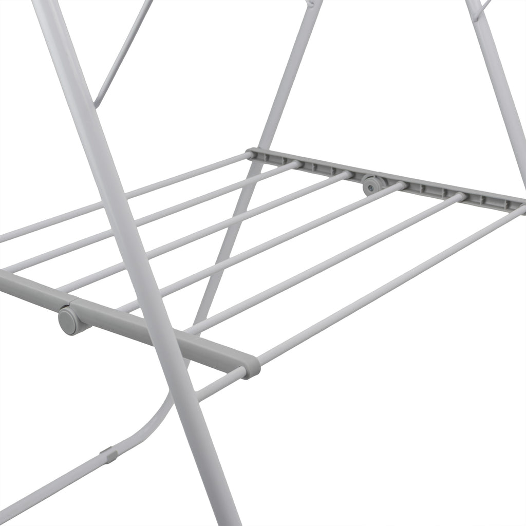 The ideal solution for drying clothes indoors - our winged indoor airer. The multi-position wings allow for all laundry types, from t-shirts to towels or increase the height and hang loner items such as towels and trousers. It offers 13 metres drying space using the wings and the extra bars at the bottom, which can also be used a shelf for drying delicates. Constructed with durable materials and powder coated with a sleek white finish. No more cluttered laundry rooms or unsightly clotheslines in the garden - with our winged indoor airer, you can achieve a perfectly dried and neatly organised laundry, no matter the weather outside. Our airer offers a practical and cost-effective way to keep your clothes fresh and dry, without the need for a costly dryer or outdoor space.