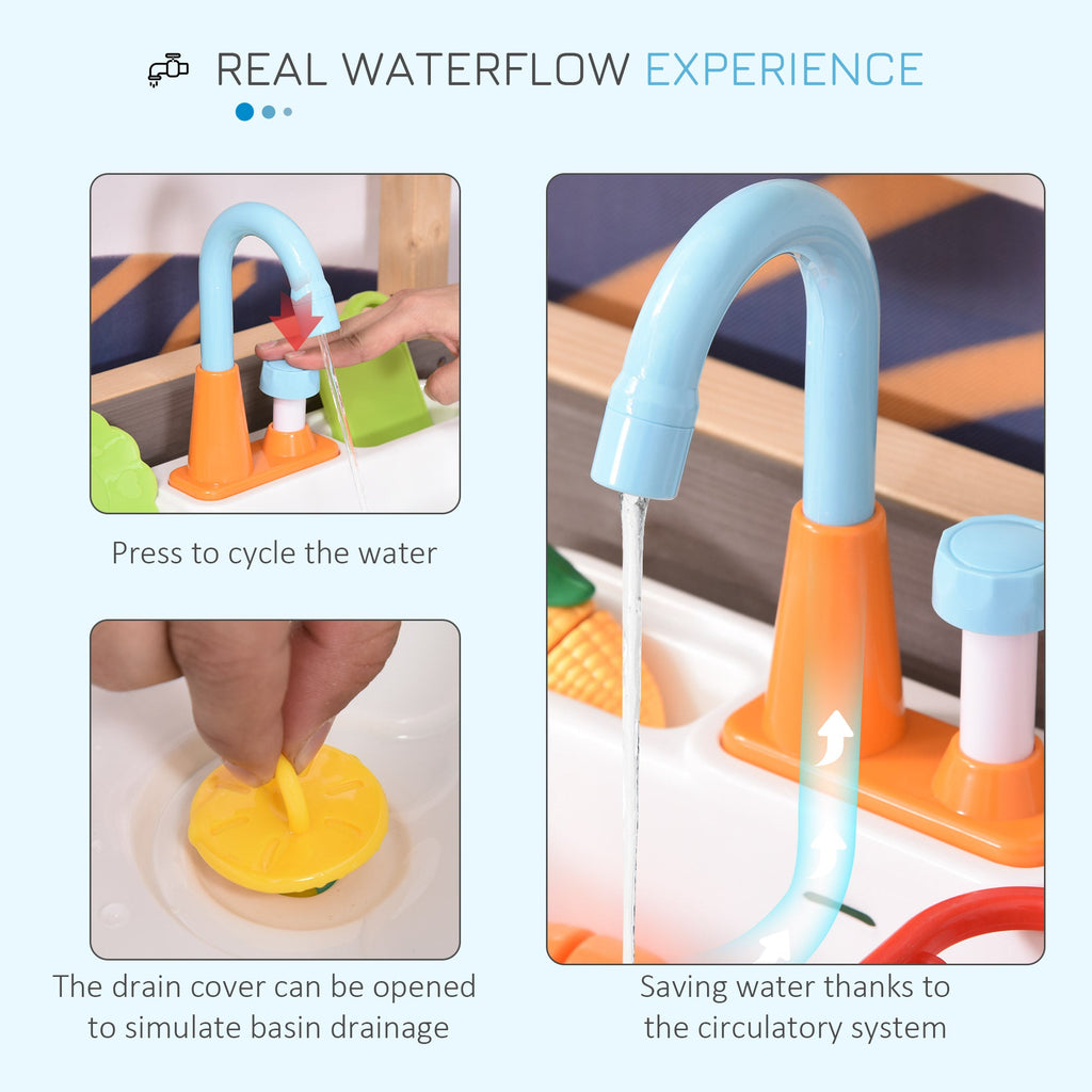 REALISTIC ROLE PLAY: The kitchen set includes a food basket, sink, water-tap, dinner plate, chopping board, knife, and vegetables, making it feel like they're in their own kitchen. REAL FLOWING WATER: Makes set extra fun. Simply press the water pump for it to work. Drain cover to reuse water to prevent wastage. SAFE: Spruce wood structure is solid and tough, with smooth plastic accents for extra durability. STORAGE SHELF: Easy to keep all items together and stored when not in use. Slatted design to prevent liquid build up. DIMENSIONS: 75L x 40W x 100Hcm. Maximum load: 50kg. For ages 3-7 years.
