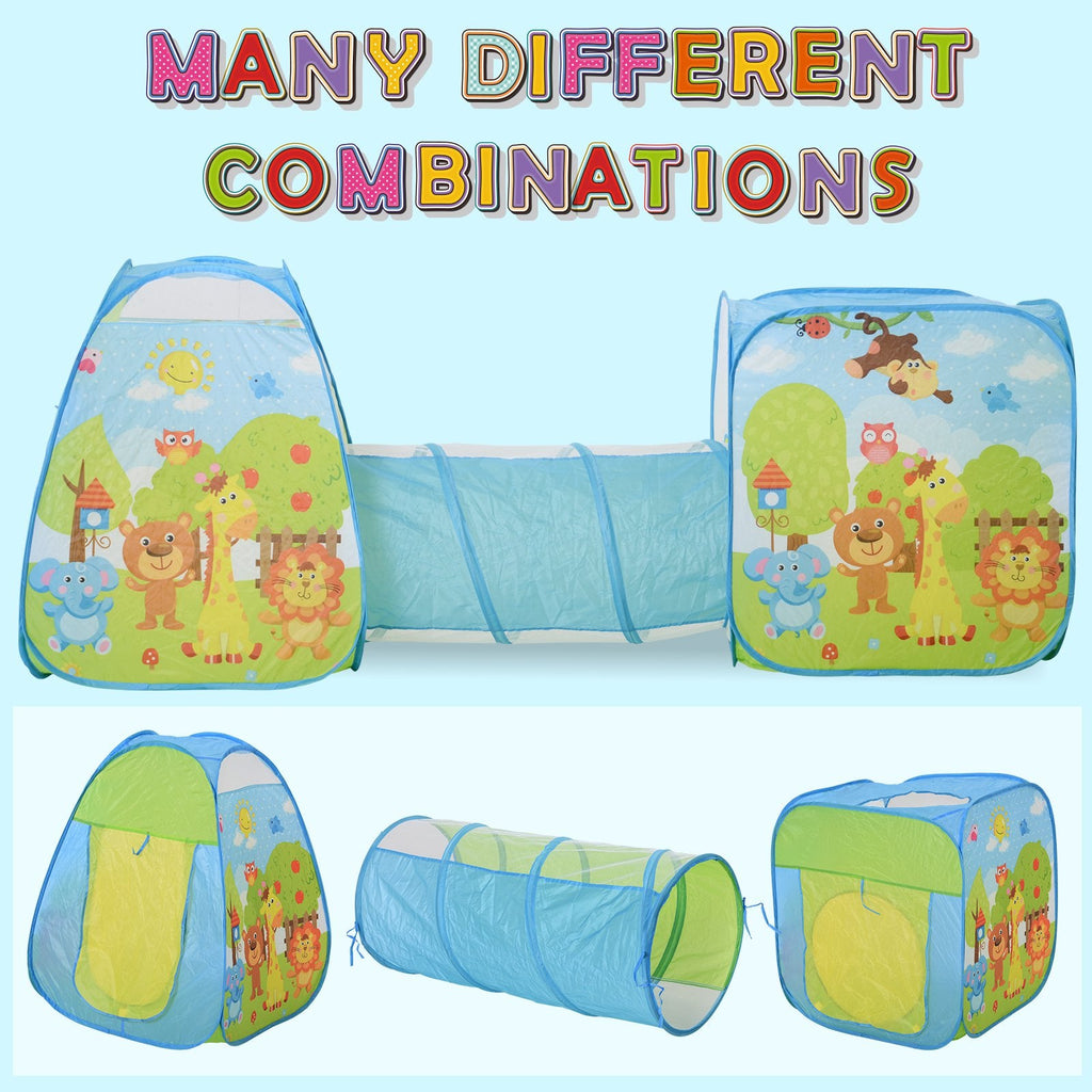 Give your child a new world to explore, play and have lots of fun with this play tent from HOMCOM. Bright, colourful and covered in a friendly animal design they?ll absolutely love, it is made into three-part design, consisting of a triangle and square tent, connected via long tunnel, allowing them to crawl back and forth, having different toys and games in the different tunnels to keep them engaged and entertained. Made from polyester with breathable mesh for safety, with roll-up doors for easy access, its lightweight and portable design can be set up and packed up almost instantly ? simply twist and fold. Fun and games has never been so quick to unfold. Features: - 3-in-1 design features a square play tent and a triangle play tent, connected via the middle tunnel. - Made from polyester with mesh, it is safe, soft, breathable and can be wiped be clean easily. - Private and separated spaces for two different play areas, keeping them entertained for hours. - Roll-up doors for easy access. - Colourful design with animals is fun and vibrant. - East to set up and pack away, simply twist and (un)fold. - For ages 3 years+. - Not recommened for outdoor use. Specification: - Item Name: Playhouse. - Brand Name: HOMCOM. - Colour: Green and Blue. - Material: 190T Polyester, Mesh, Steel Wire. - Overall Dimension: 230 L x 74 W x 93 H cm. - Taper Tent Size: 69 L x 69 W x 93 H cm. - Tunnel Size: ? 45 x 97 L cm. - Cube Tent Size: 74 L x 74 W x 79 H cm. - Door Size: ?40cm, ?42cm, ?42cm. - Suitable for kids over 3 years old. - EN71-1,2,3 certificated product. - Flat Pack: Yes. - Custom Label: 345-011. 3-IN-1 DESIGN: Combines a square play tent and a triangle play tent, connected via a middle tunnel, giving them their own private space, where different games and activities can be separated to keep them entertained for hours on end. SAFE MATERIAL: Polyester with mesh, it is soft, breathable and can be cleaned easy for hygiene. EASY TO SET UP: Simply twist for it to unfold and be ready in seconds. Also packs up the same ? saving lots of time and effort. ROLL-UP DOORS: Provide easy access and stay in place when up. COLOURFUL DESIGN: Bright and covered in a multi-animal print, a piece they?ll love instantly. FOR AGES 3 YEARS+. DIMENSIONS: 93H x 230L x 74Wcm. Square tent: 79H x 74L x 74Wcm. Triangle tent: 93H x 69L x 69Wcm. Tunnel: ?45 x 97Lcm.
