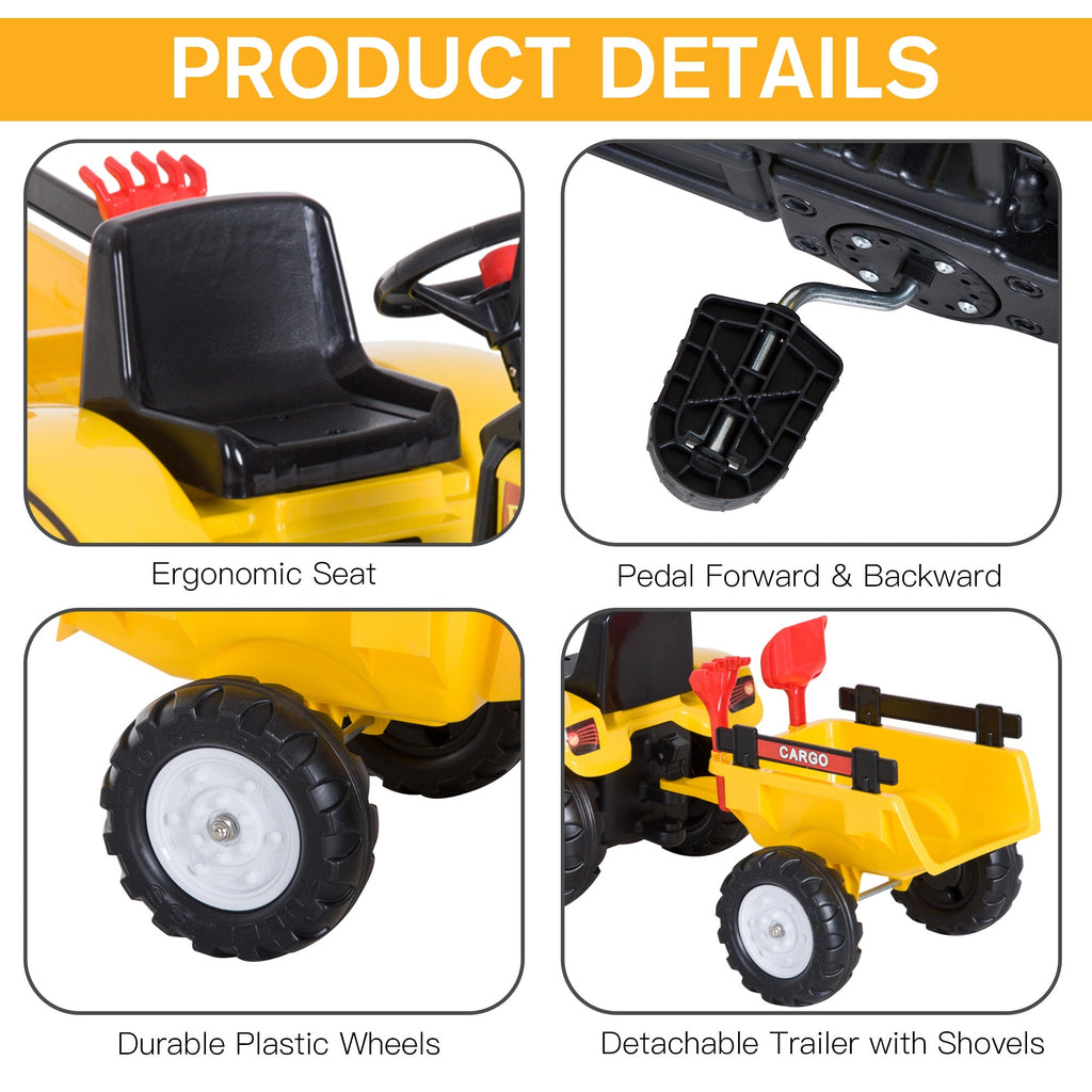 Give them their first taste of driving with this ride on tractor from HOMCOM. Made from metal, the frame is strong and rigid to provide years of fun, supporting a weight up to 35kg with it featuring a wide seat for comfort, four anti-slip wheels for a smooth ride, a steering wheel and two pedals to move forwards and backwards. With a back trailer and a shovel and rake for extra fun to enhance their imagination, it is completed with stickers all over for a cool look. Ideal for getting them to exercise outdoors while having lots of fun.