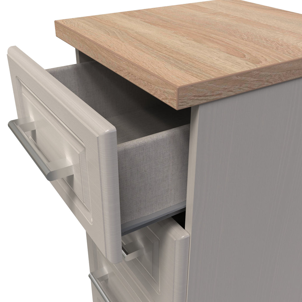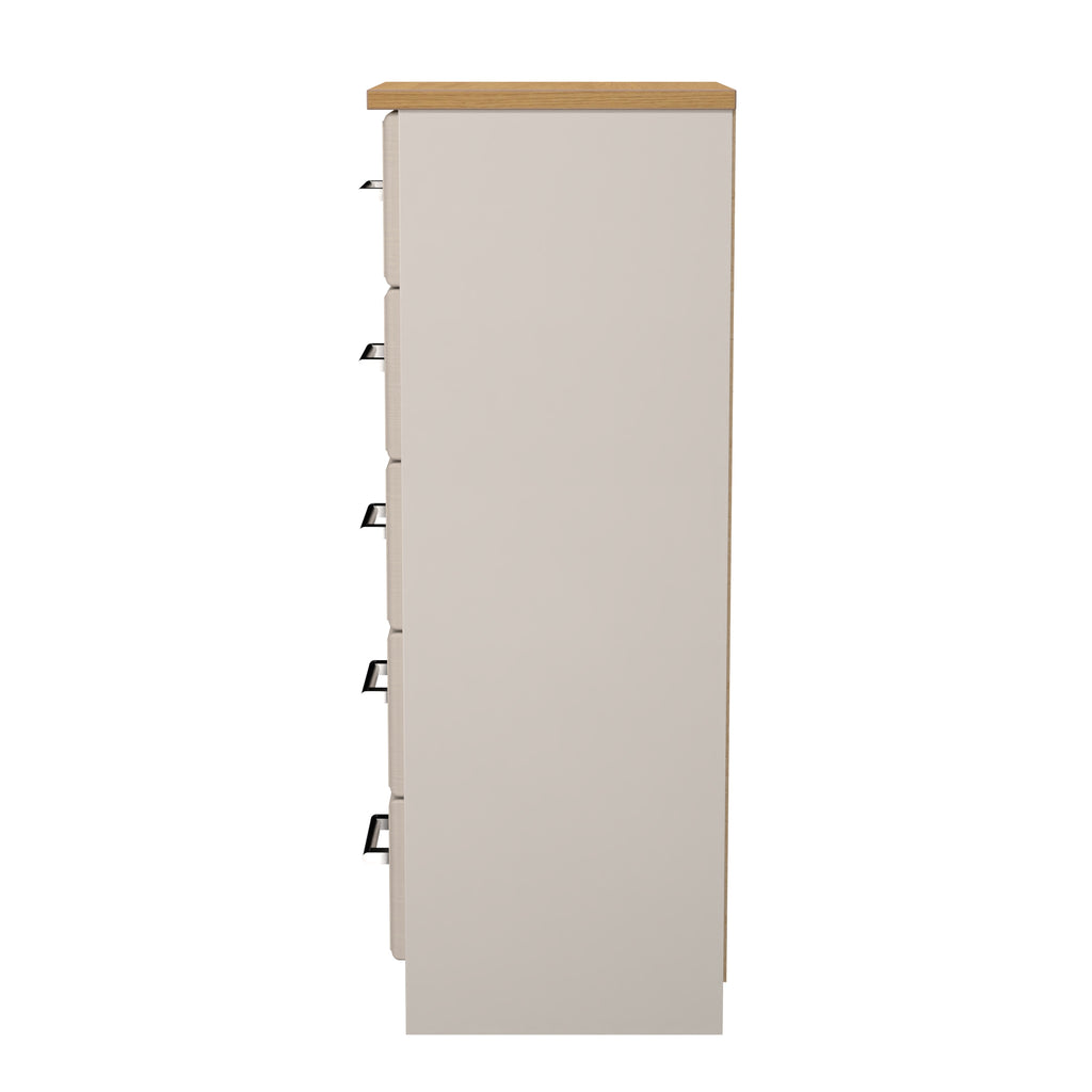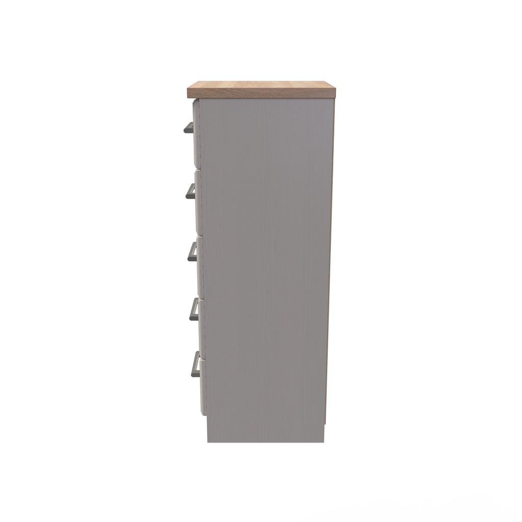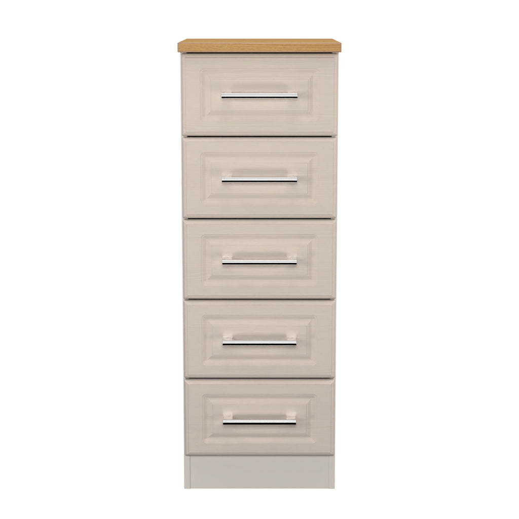 (Dimensions: H108 x W37 x D39cm) This 5 drawer chest of drawers is practical and stylish. Perfect for any home as a free standing storage unit. The Kent range uses traditional edge finishes and wood effect tops, to create a range of classic looking furniture pieces. Contrasting finishes create the tonal variations seen here with brushed steel handle mounted on wood grained fronts. All our furniture is made in the United Kingdom, to the highest quality. It is delivered direct to your location of choice by one of our two man delivery teams, and comes fully assembled (although legs may be removed to prevent damage in transit).