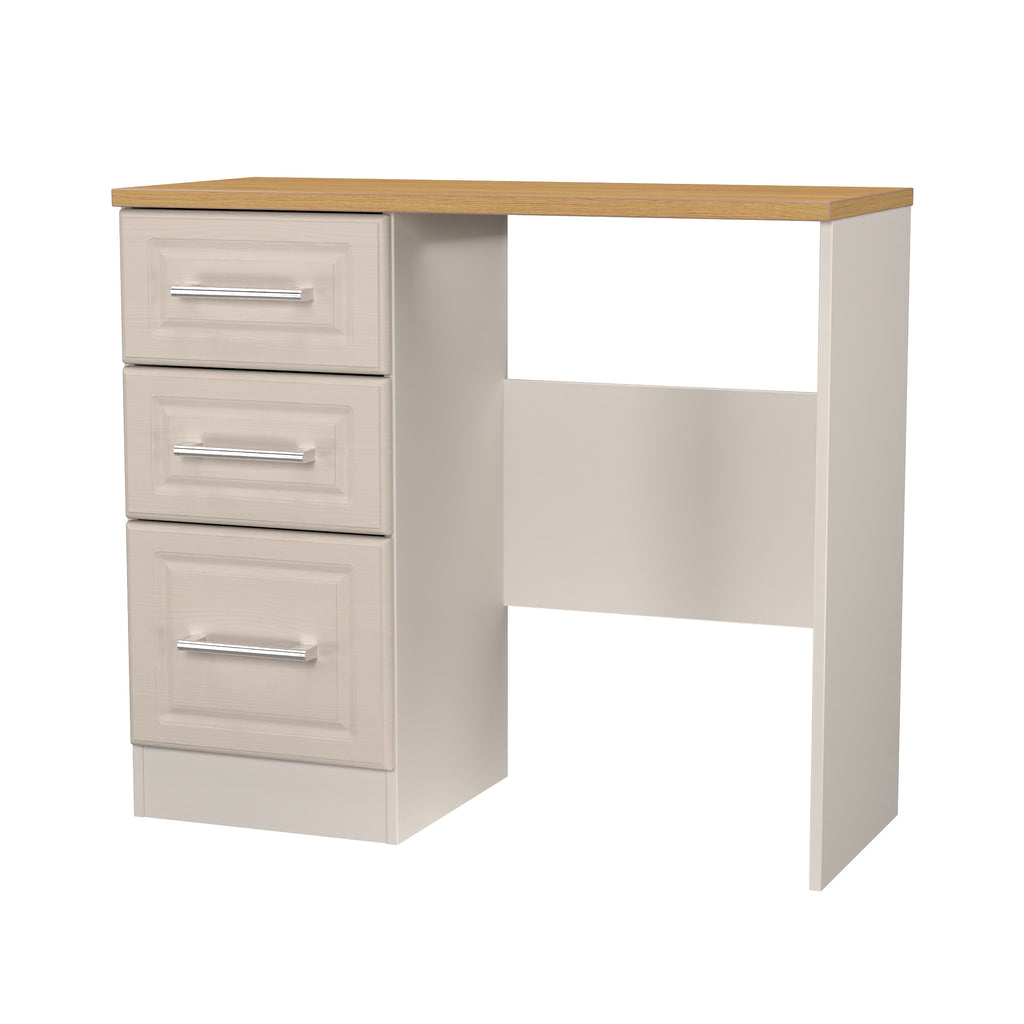 (Dimensions: H80 x W90 x D39cm) This practical 3 drawer narrow desk/vanity is perfect for any bedroom or office. A matching stool and mirror (in 2 sizes) are also available. The Kent range uses traditional edge finishes and wood effect tops, to create a range of classic looking furniture pieces. Contrasting finishes create the tonal variations seen here with brushed steel handle mounted on wood grained fronts. All our furniture is made in the United Kingdom, to the highest quality. It is delivered direct to your location of choice by one of our two man delivery teams, and comes fully assembled (although legs may be removed to prevent damage in transit).