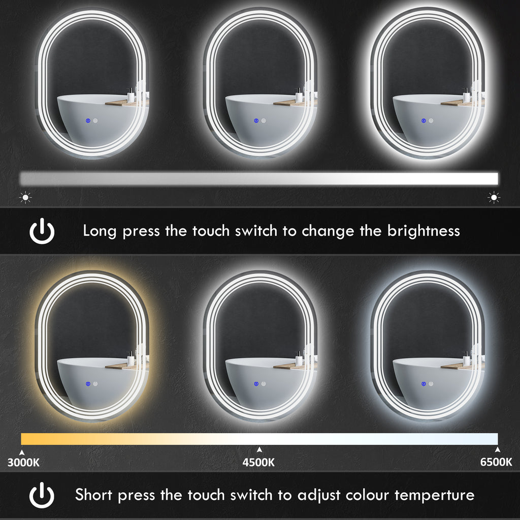 Not only a bathroom essential, but this kleankin LED mirror is a trendy piece for your everyday place of hygiene. A smoothly curved modern oval design, this is a modern design. The edge is fitted with an adjustable LED light - use the touch sensor to adjust the brightness and colour between warm white, white and cold white. The anti-fog function means the mirror doesn't become steamy, so you can see your reflection in this makeup mirror, even straight out from the shower.