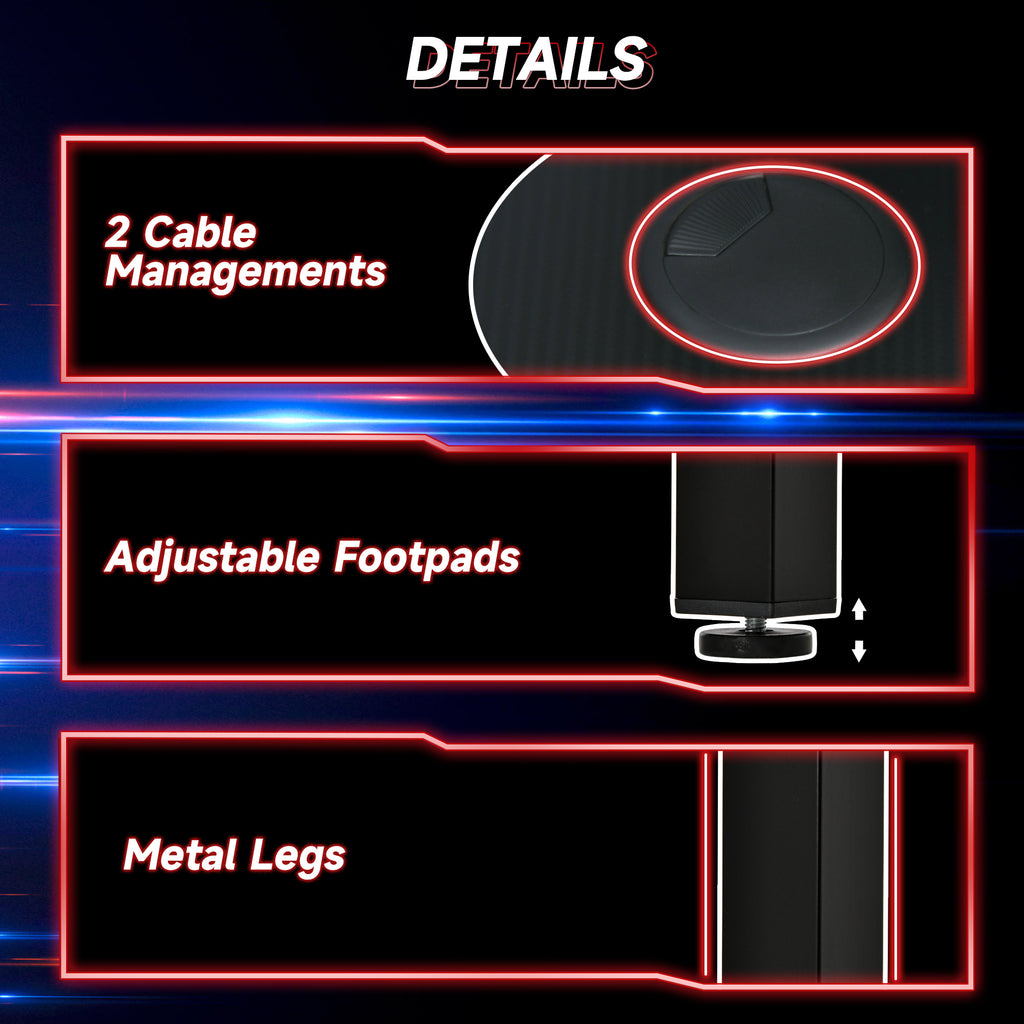 Attention to detail wins games, and trust that this ergonomic gaming desk is built to win. 'L' shape design gives more working space than your average table - room for two screens/monitors, keyboard, work/gaming essentials, whilst giving you plenty of freedom to work and play. The frame is made for metal for a solid base, supporting up to 50 kg. Durable particle board table-top is covered in a textured finish for a standout look. Completed with two cable holes at the back.