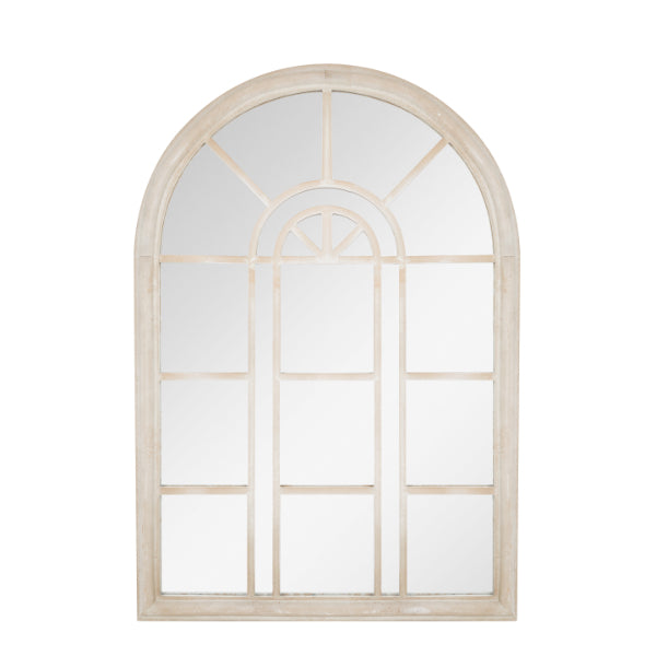 Boasting a rounded arch design with an art deco aesthetic and neutral stone-coloured finish, this mirror makes an attractive addition to any outdoor space.