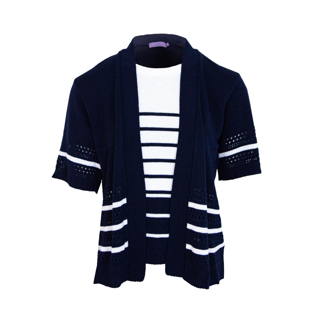- A knitted vest attached to a short sleeve cardigan makes this the perfect piece for every occasion at minimal effort.